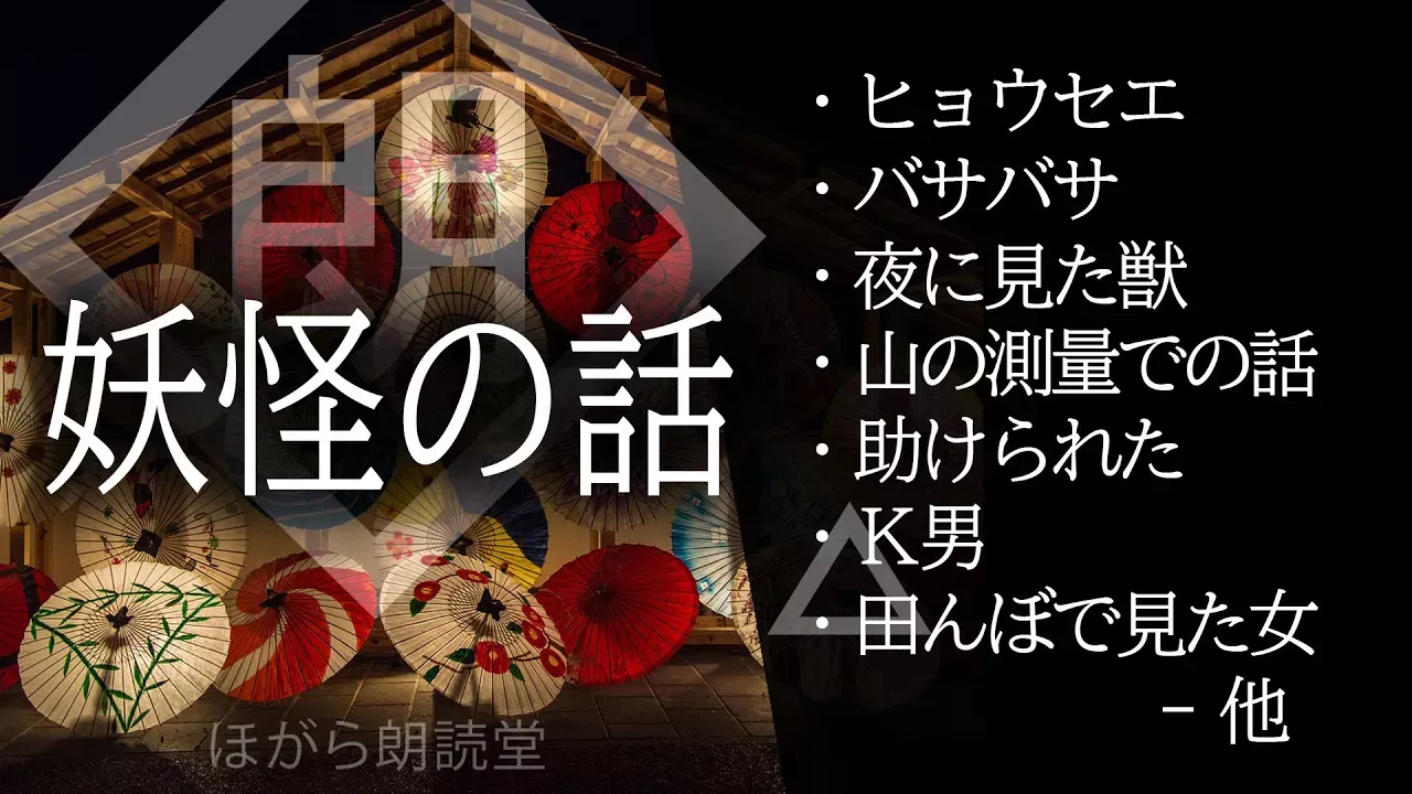00:00:00 OP 00:00:10 ヌメヌメした不気味な生物 00:02:43 K男 00:07:26 ばあちゃんから聞いた話 00:12:48 ヒョウセエ 00:20:05 バサバサ 00:22:23 「ブライダルフェア ジッシチュウ!!」. 00:28:56 夜に見た獣 00:32:03 人の形をした真っ黒いもの 00:36:41 山の測量での話 00:49:49 逃げる空き瓶 00:51:54 助けられた 00:56:26 化かされるにも程がある 01:00:14 田んぼで見た女 01:03:00 梅田の地下街で見た「何か」 リクエストや質問、怖い話等の投稿はこちらまで。(マシュマロ質問箱) https://marshmallow-qa.com/hogara_rodoku ほがら朗読堂 ニコニコ支店 https://www.nicovideo.jp/restriction.html?error=nc-accessrestrictions-003 twitterはこちら https://twitter.com/hogara_rodoku -------------------------- #ほがら朗読堂#朗読