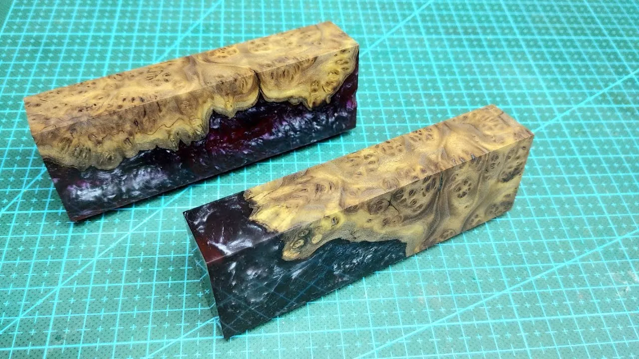 Hybrid bar 2, a beautiful blank for a knife handle. In this video, I continue making blanks of hybrid bars for knife handles. As a wooden part of the blank, I use poplar burl soaked in pentacryl. And all this is filled with LUX epoxy resin.