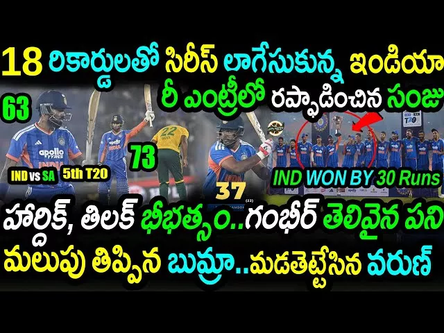 IND vs SA 5th T20 Highlights: Series Win! 🏆 | Hardik’s Fastest 50 & Varun’s Record | 2026 WC Squad Leak? Team India has done it! 🇮🇳 The Men in Blue defeated South Africa by 30 runs in the 5th T20 at Ahmedabad to seal the series in style! From a powerful batting display to a magical bowling spell by Varun Chakravarthy, this match had it all. 🔥 Match Top Highlights: The 200+ Club: India smashed 231 runs, setting a World Record for the most 200+ scores in T20 history (35 times)! Kung Fu Pandya: Hardik Pandya destroyed the SA bowling with the fastest 50 against South Africa (just 16 balls!) and crossed 2000 T20I runs. Tilak Varma's Class: Another brilliant knock of 73 (42) by Tilak, making him the highest run-scorer against SA for India. The Openers: Abhishek Sharma & Sanju Samson gave a flying start! Abhishek became the fastest Indian to reach 1000 T20I runs (by balls faced). Spin Wizard: Varun Chakravarthy took 4 wickets, becoming the leading wicket-taker for India in T20s in 2025 with 36 wickets! The Gambhir Effect: Under Coach Gautam Gambhir, India remains unbeaten in T20 series! 🇮🇳 🚨 BIG ANNOUNCEMENT ALERT: BCCI is set to make a massive announcement on December 20th at 1:30 PM. Is the Team India Squad for the 2026 World Cup being finalized? Watch the full video to know more! ------------------------------------------------- లేటెస్ట్ స్పోర్ట్స్ న్యూస్ కోసం మా వెబ్ సైట్ ను సందర్శించండి. https://filmyposter.in/ ------------------------------------------------- Follow us on Social Media: --------------------- ❖Website: https://filmyposter.in/ ❖Facebook: https://www.facebook.com/unsupportedbrowser ❖Twitter: https://www.twitter.com/filmyposter ❖Youtube: https://www.youtube.com/filmyposter ❖Instagram: https://www.facebook.com/unsupportedbrowser ------------------------------------------------- Music Credits: https://www.youtube.com/audiolibrary/music