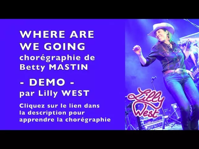 [DEMO] WHERE ARE WE GOING de Betty MASTIN, enseignée par Lilly WEST 🎥 (EXPLICATION DES PAS : https://youtu.be/nD0PoYwM0Nc) 🔥 Chorégraphie de Betty MASTIN (septembre 2021) 🔥 Musique " Where Are We Goin' " de Luke BRYAN 32 Temps, 4 Murs, Niveau Débutant + 0 Tag, 0 Restart 😁 enseignée en français par Lilly WEST 🥳 élue au POT COMMUN 2023-2024 Nouvelle Aquitaine - Niveau DEBUTANT 🔥 Retrouvez la fiche en français de la chorégraphie sur le site de Lilly WEST, à la page "Chorégraphies" : https://www.lillywest.fr 👇 👇 👇 👇 👇 👇 👇 👇 👇 👇 👇 👇 👇 👇 👇 👇 👇 👇 👇 👇 ♥️ Vous aimez la danse country ? ♥️ Abonnez-vous à ma chaîne et dansons ensemble ! ♥️ De nouvelles chorégraphies chaque semaine ... ♥️ https://www.youtube.com/c/LillyWEST 👇 👇 👇 👇 👇 👇 👇 👇 👇 👇 👇 👇 👇 👇 👇 👇 👇 👇 👇 👇 Retrouvez Lilly West en concert en tant que chanteuse musicienne, et sur les pistes de danse en tant qu'animatrice de danse country. 💡 Séjours de danse country (en France et en Espagne) : https://www.countrydancetour.com 💡 Site officiel : https://www.lillywest.fr 💡 Page Facebook : https://www.facebook.com/lillywest.fr 💡 Chaîne Youtube : https://www.youtube.com/c/LillyWEST