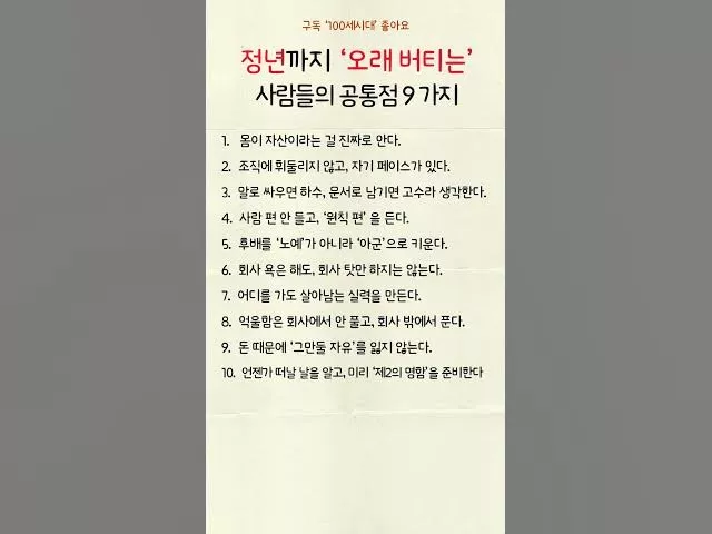몸이 진짜 자산이라는 걸 아는 사람만이 정년까지 버티는 것 같습니다. 조직 눈치보다 자기 페이스를 지키고, 감정싸움 대신 기록과 원칙으로 버티고, 후배를 내편으로 키우는 사람이 결국 오래 가더군요. 언젠가 회사를 떠나도 부를 수 있는 ‘제2의 이름’을 준비하는 것도 빼놓을 수 없고요. 여러분은 이 9가지 중에 지금 제일 잘하고 있는 것 하나, 당장 고쳐보고 싶은 것 하나가 있다면 무엇인가요?