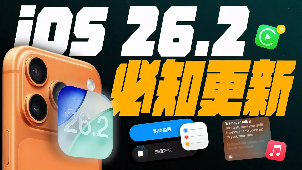 iOS 26.2 正式推出啦!這次更新最大的亮點,就是 iPhone 17 系列困擾大家已久的「爆 Ping、網路延遲」終於被修好了。到底修得如何?真的穩了嗎? 這支影片會帶你一次看懂所有更新亮點,一定要點進來看 👉 https://www.youtube.com/watch?v=o8JZ-GNmymA 相關影片 ▪️ https://www.youtube.com/watch?v=PWWwZj5_mXw ▪️ https://www.youtube.com/watch?v=UEQAjvJ2Q8U ▪️ https://www.youtube.com/watch?v=C6pD-hmcz7A ▪️ https://www.youtube.com/watch?v=4K0VpV8-Qbo ---------------------------------------------------------------------- 🌟 成為頻道會員:https://www.youtube.com/channel/UCCC_m0Lw7Z4IT6IjoPb0ZLg/join 🌟 只要你是【我是蘋果迷】 等級的頻道會員,就能申請 【會員專屬LINE社群】 有任何問題,可協助快速排解 👉https://www.youtube.com/post/UgkxZEkRaUsfn7T2_nvKxek_GcEJnqv8VHmK 0:00 開場 0:31 重點1 :iPhone 17「爆 Ping」問題,真的修好了嗎? 2:12 重點 2 :更多 Liquid Glass 液態玻璃 3:03 重點 3:AirDrop 新增功能 3:46 重點 4:提醒事項加入「鬧鐘」功能 4:25 重點 5:Apple Music 支援離線歌詞 4:55 重點 6:無邊記 App 加入新功能 5:18 重點 7:密碼 App 加入「不儲存名單」 6:24 重點 8:螢幕也能當警示閃光 7:02 重點 9:睡眠分數的區間重新調整 7:52 重點 10:CarPlay 可關閉釘選訊息 8:40 該現在就更新嗎? 🔥🔥 快追蹤 APPLEFANS蘋果迷: 📍APPLEFANS 官網:https://applefans.today/ 📍Facebook:https://www.facebook.com/unsupportedbrowser 📍FB 社團:https://www.facebook.com/unsupportedbrowser 📍Instagram:https://www.facebook.com/unsupportedbrowser