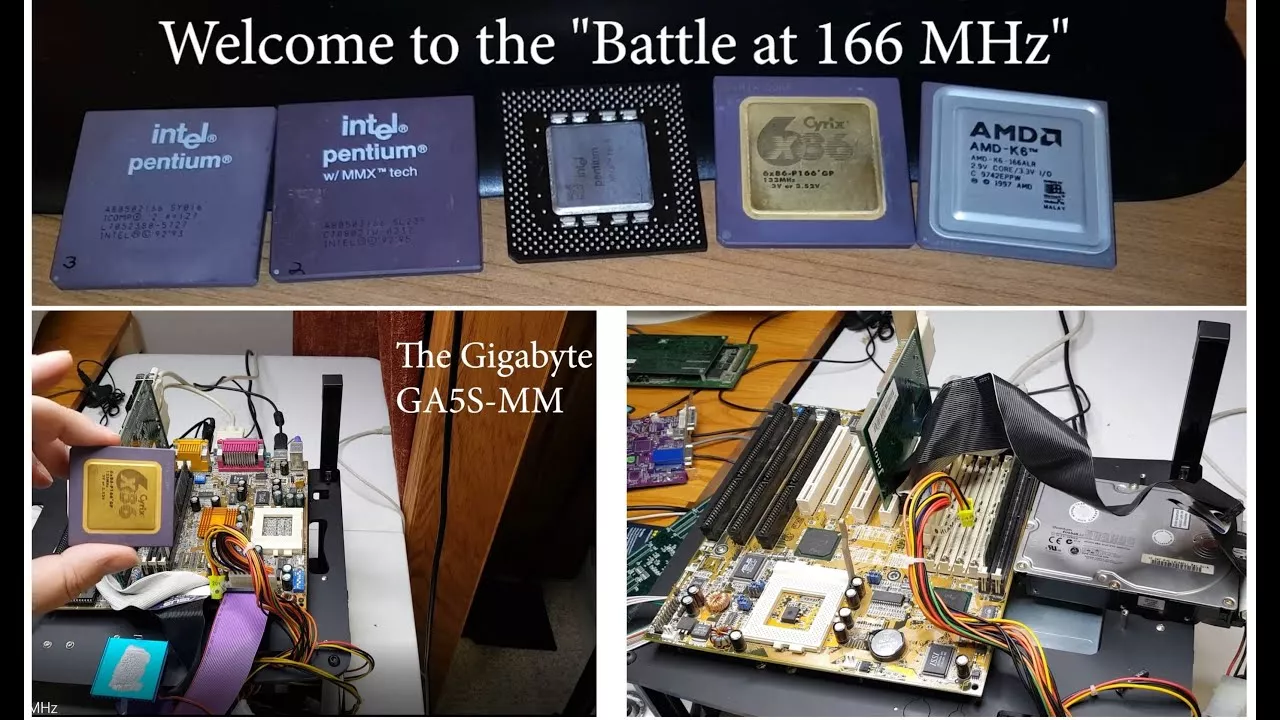 Welcome to the Battle of the 166 MHz CPUs! Featuring 2 motherboards (because things just don't ever go as planned) from Gigabyte and ASUS running CPUs from Intel, AMD, and Cyrix. Throw in a Diamond Monster II Voodoo2 graphics card and watch things fly! Index: 0:00 Introduction to the CPU contestants 2:00 The Gigabyte GA5S-MM motherboard and the problems with Cyrix on it 7:04 First solution: Try a different video card (fail) 9:15 2nd solution: Bring out the ASUS TX97-LE motherboard and re-test! 12:42 The benchmark suites 14:59 The results on graph with final thoughts