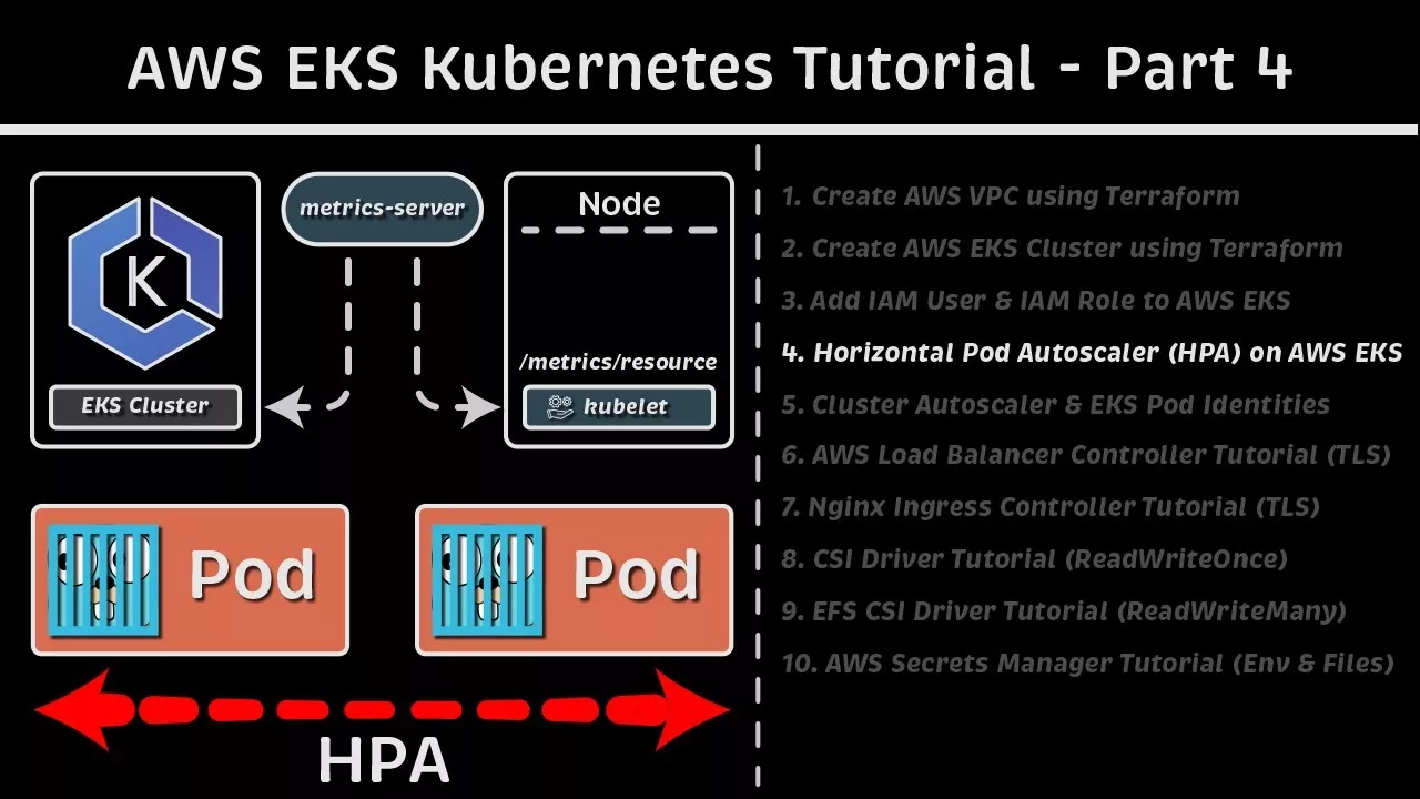 👨💼📈 Mentorship/On-the-Job Support/Consulting - https://calendly.com/antonputra/youtube or me@antonputra.com 🍿 Benchmarks: https://youtube.com/playlist?list=PLiMWaCMwGJXmcDLvMQeORJ-j_jayKaLVn&si=p-UOaVM_6_SFx52H 👋 AWS is expensive - Infra Support Fund: https://buymeacoffee.com/antonputra 👉 [Playlist] AWS EKS Kubernetes Tutorial: https://youtube.com/playlist?list=PLiMWaCMwGJXnKY6XmeifEpjIfkWRo9v2l&si=wc6LIC5V2tD-Tzwl 👉 Kubernetes Tutorial for Beginners [Full Course]: https://www.youtube.com/playlist?list=PLiMWaCMwGJXkYKFa_x0Ch38uznuv-4c3l 👉 AWS EKS Tutorial for Beginners [Full Course]: https://youtu.be/kwq9EfELYII 👉 Other Kubernetes Tutorials: https://www.youtube.com/playlist?list=PLiMWaCMwGJXnKY6XmeifEpjIfkWRo9v2l 1. Create AWS VPC using Terraform 2. Create AWS EKS Cluster using Terraform 3. Add IAM User & IAM Role to AWS EKS 4. Horizontal Pod Autoscaler (HPA) on AWS EKS 5. Cluster Autoscaler Tutorial (EKS Pod Identities) 6. AWS Load Balancer Controller Tutorial (TLS) 7. Nginx Ingress Controller Tutorial (Cert-Manager & TLS) 8. CSI Driver Tutorial (ReadWriteOnce) 9. EFS CSI Driver Tutorial (ReadWriteMany) 10. AWS Secrets Manager Tutorial (Env & Files) Based on the feedback, I’ll add the following sections (let me know if anything else is missing): - Autoscaling with Karpenter - Autoscaling with Keda - Private Ingress with Private DNS & VPN - Monitoring with Prometheus - EKS self managed group - EKS Fargate - EKS Pod Identities vs. EKS IRSA (oidc) vs. Node roles ▬▬▬▬▬ Experience & Location 💼 ▬▬▬▬▬ ► I’m a Senior Software Engineer at Juniper Networks (13+ years of experience) ► Located in San Francisco Bay Area, CA (US citizen) ▬▬▬▬▬▬ Connect with me 👋 ▬▬▬▬▬▬ ► LinkedIn: https://www.linkedin.com/in/anton-putra ► Twitter/X: https://twitter.com/antonvputra ► GitHub: https://github.com/antonputra ► Email: me@antonputra.com ▬▬▬▬▬▬ Related videos 👨🏫 ▬▬▬▬▬▬ 👉 [Playlist] Kubernetes Tutorials: https://www.youtube.com/playlist?list=PLiMWaCMwGJXnHmccp2xlBENZ1xr4FpjXF 👉 [Playlist] Terraform Tutorials: https://www.youtube.com/playlist?list=PLiMWaCMwGJXmJdmfJjG3aK1IkU7oWvxIj 👉 [Playlist] Network Tutorials: https://www.youtube.com/playlist?list=PLiMWaCMwGJXluySjXqWG6fg1H1hzd-zWz 👉 [Playlist] Apache Kafka Tutorials: https://www.youtube.com/playlist?list=PLiMWaCMwGJXlL8-E-xu8RBwyC5YfS3V5e 👉 [Playlist] Performance Benchmarks: https://www.youtube.com/playlist?list=PLiMWaCMwGJXl-h2RgOSpdO-pQaSRwlVjd 👉 [Playlist] Database Tutorials: https://www.youtube.com/playlist?list=PLiMWaCMwGJXnhmmh5pu9sdWekdRwAzV5f ▬▬▬▬▬▬▬ Timestamps ⏰ ▬▬▬▬▬▬▬ 0:00 Overview 1:52 Install Metrics Server on EKS 5:05 Horizontal Pod Autoscaler (HPA) Demo ▬▬▬▬▬▬▬ Source Code 📚 ▬▬▬▬▬▬▬ ► Up-to-date code, updated regularly once a month: https://github.com/antonputra/tutorials/tree/main/lessons/196 ► Original code: https://github.com/antonputra/tutorials/tree/main/lessons/195 #AWS #EKS #Kubernetes
