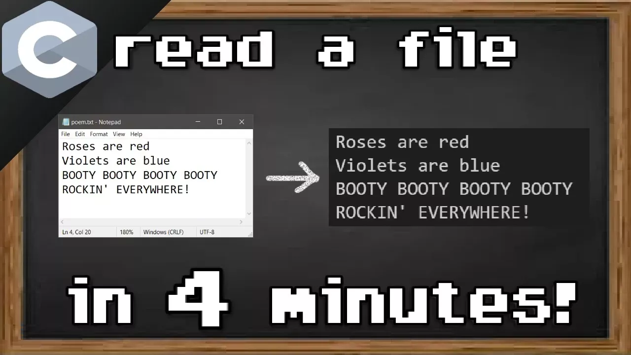 C read a file tutorial example explained int main() { FILE *pF = fopen("poem.txt", "r"); char buffer[255]; if(pF == NULL) { printf("Unable to open file!\n"); } else { while(fgets(buffer, 255, pF) != NULL) { printf("%s", buffer); } } fclose(pF); return 0; }