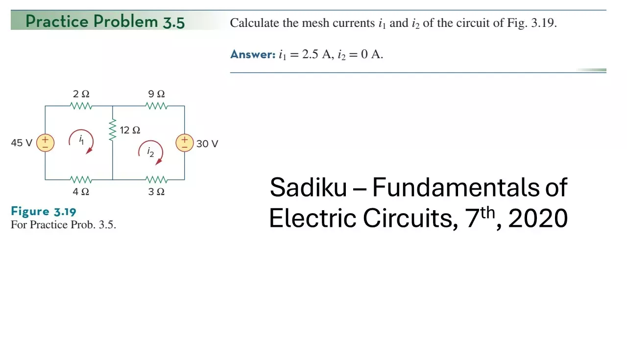 Calculate the mesh currents i1 and i2 of the circuit of Fig. 3. 19. Answer: i1 = 2.5 A, i2 = 0 A Fundamental of Electric Circuits Solutions Manual, Fundamental of Electric Circuits Instructions Manual, Fundamental of Electric Circuits Homework Solutions, Fundamental of Electric Circuits Free Ebook, Fundamental of Electric Circuits Alexander Sadiku, Alexander Sadiku Circuits Practice Problems Solutions, Practice Problem 3.5 Alexander Sadiku 5th Ed: Fundamental of Electric Circuits Chapter 3: https://www.youtube.com/watch?v=L-UAtGgdPKo&list=PLCAwaB3_Khbd4YTSlCpeOn8dTGJwlFuQY Alexander Sadiku 5th Ed: Fundamental of Electric Circuits Chapter 4: https://www.youtube.com/watch?v=97VoEY4U_nc&list=PLCAwaB3_KhbeJoV27gxtpobNOvVYev6p_ Alexander Sadiku 5th Ed: Fundamental of Electric Circuits Chapter 5: https://www.youtube.com/playlist?list=PLCAwaB3_KhbdJaAn-h4G5BHdtFv-jnXT- Alexander Sadiku 5th Ed: Fundamental of Electric Circuits Chapter 6: https://www.youtube.com/watch?v=tgjosWIuv4Q&list=PLCAwaB3_KhbddLnYEfF8XB4MeOXNsGIzT Alexander Sadiku 5th Ed: Fundamental of Electric Circuits Chapter 7: https://www.youtube.com/playlist?list=PLCAwaB3_KhbeeCtgLWjpembiizhrC2Wc5 Alexander Sadiku 5th Ed: Fundamental of Electric Circuits Chapter 15: https://www.youtube.com/playlist?list=PLCAwaB3_Khbd11xhz52XU0p33UQBd3ncn Basic integrals: https://www.youtube.com/watch?v=xr47WdCb_4U&list=PLCAwaB3_KhbfG7fkAnfplbuZsGH1n1qVG