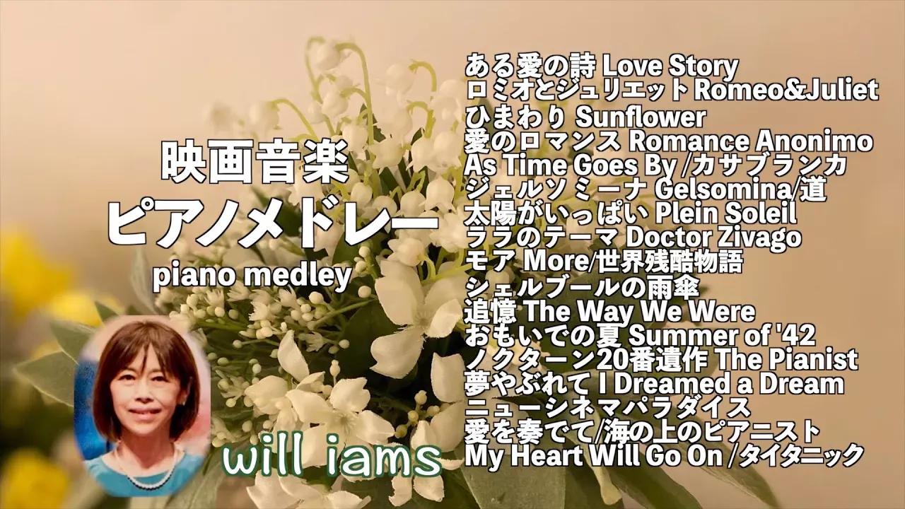 ラストの余韻が切なすぎる映画をあつめました。往年の名作からタイタニックまで、ピアノメドレーでお聴きください。ご視聴ありがとうございます。 0:00 【ある愛の詩 ピアノ】フランシス・レイ Francis Lai 映画「 LOVE STORY-THEME ある愛の詩」(1970年)より https://youtu.be/HiRMkOVR6po 3:07 【ロミオとジュリエット 愛のテーマ ピアノ】映画「ロミオとジュリエット」 1968年/ニーノ・ロータ https://youtu.be/I5zupn989cc 6:49 【ひまわり ピアノ】ヘンリー・マンシーニ 映画 「ひまわり」 1970年 Love Theme From Sunflower /Henry Mancini https://youtu.be/96tTFI-V-BM 9:34 【 愛のロマンス/禁じられた遊び 上級ピアノサウンズより】映画『禁じられた遊び』1952年 主題歌 https://youtu.be/TtA0VaC-J_s 13:10 【 As Time Goes By 時の過ぎゆくままに/Jazzサウンズより】 映画『カサブランカ』1942年 テーマ曲 ハーマン・フップフェルド作曲(1931年) https://youtu.be/h7VA2KWZuN8 17:05 《録音•録画風景と機材紹介 ピアノ》【ジェルソミーナ Gelsomina/ニーノ・ ロータ 】映画 「道」 1954年/ Nino Rota 羽田健太郎アレンジ https://youtu.be/LERyisdvLpY 19:46 【 太陽がいっぱい /ニーノ・ロータ ピアノ】1960年 映画 「太陽がいっぱい(Plein Soleil) 」より https://youtu.be/Ryzn6nV4qKg 23:18 【ララのテーマ/ ピアノ】『ドクトル・ジバゴ』1965年 Somewhere My Love Lara's Theme from “Dr. Zhivago” https://youtu.be/gWTTvmz0K7o 25:51 【モア More ピアノ】1962年 映画『世界残酷物語』テーマ曲 リズ・オルトラーニ作曲 羽田健太郎アレンジ https://youtu.be/RV-e4v42Qh4 30:08 【シェルブールの雨傘 / ミシェル・ルグラン〜ポール・モーリア】 Michel Legrand 1964年 https://youtu.be/1XQVX0SoFR4 34:05 【追憶 "上級ピアノサウンズ" より】映画 「追憶」1973年 The Way We Were 主題歌 https://youtu.be/cndAQwn0-7Y 38:17 【おもいでの夏 Summer of '42/ミシェル・ルグラン ピアノ】Michel Legrand 1971年 映画『Summer of '42』主題曲 https://youtu.be/f939DfhVm1E 41:54 【ノクターン20番 遺作/ショパン 】Chopin/ Nocturne Op.posth Cis moll 映画『戦場のピアニスト』より https://youtu.be/GLOFD4O70UI 45:59 【夢やぶれて I Dreamed A Dream/レ・ミゼラブル 上級ピアノサウンズより】 ミュージカル『レ・ミゼラブル』Les Miserables 挿入歌 https://youtu.be/w69q2e_w88w 50:17 【ニュー・シネマ・パラダイス メドレー/Ennio Morricone ピアノ】メイン・テーマ〜愛のテーマ『 ニュー・シネマ・パラダイス』1988年 https://youtu.be/prA7VWeHKl4 55:44 【愛を奏でて /エンニオ・モリコーネ】映画『海の上のピアニスト』より E.Morricone 1988年 内田美雪アレンジ https://youtu.be/dSo7zZIi8TA 1:00:37 【My Heart Will Go On タイタニック/ピアノ】 映画 「TITANIC」主題歌 1997年 https://youtu.be/sYZlnmH8DfY ❤️ヴァイオリンとピアノで歌う『なつかしの童謡唱歌チャンネル』にぜひお立ち寄りください 【浜辺のうた Hamabe no Uta/ヴァイオリンとピアノ Violin&Piano】“歌詞付き” 林古渓 作詞 成田為三 作曲 https://youtu.be/JXs5DJR5j94 【映画音楽1960年代〜”ひまわり” まで ピアノ 1時間 21曲】BGM 1hour https://youtu.be/hKJv9J1NZMM 【不朽の名作 映画 ピアノメドレー22曲『カサブランカ〜1950年代』1時間 BGM Medley https://youtu.be/j5fovy7_T_s 【ポール・モーリア1時間 18曲 ピアノ/Paul Mauriat 】BGM 1 hour https://youtu.be/bhrAr-wXfEg 【気分のもり上がるクラシック1時間 16曲 ピアノ】BGM 1 hour メドレー https://youtu.be/obqpxvnAXY4 【珠玉のピアノ名曲集 1時間】BGM 1 hour https://youtu.be/ScZL_jXb1z4 【珠玉のピアノ②名曲集 17曲1時間 ピアノ】BGM 1 hour medley メドレー https://youtu.be/ewNjdpAhC2c 【映画1980年〜'90年代 1時間 18曲 】BGM "金曜ロードショーテーマ曲" 付き メドレー https://youtu.be/na_QWgsaDAk 【洋楽ヒットソング ピアノメドレー16曲】1時間 BGM Medley https://youtu.be/jMYkjuuP8rg 【中島みゆき ピアノメドレー11曲】 BGM Medley https://youtu.be/YEEKNxMno8o 【平成のヒット曲 ピアノメドレー 1990年〜2000年代 15曲】1 hour BGM Medley https://youtu.be/NcK0jcnX7bk 【洋楽ヒットソング② ピアノメドレー16曲】1時間BGM piano Medley https://youtu.be/c177xSJEIaI 【癒しの ピアノ メドレー15曲】1時間 André Gagnon/ Yiruma/S.E.N.S./Kenny G BGM piano Medley https://youtu.be/3mWLhULwvw4 【ショパン ピアノメドレー18曲 〜エチュード 英雄ポロネーズ ワルツ ノクターン】BGM Chopin 1 hour medley https://youtu.be/9QUNPMm9YiU 【懐かしのTVドラマ 主題歌 ピアノメドレー18曲 〜俺たちの旅 Gメン’75 太陽にほえろ!冬のソナタ 水戸黄門 犬神家の一族 他】 BGM 1 hour medley https://youtu.be/ngTSQHKM90Q 【ピアノ発表会おすすめ 20曲メドレー B〜C級(初中級)】「手元画像あり」 時間の短い順 1分から5分まで https://youtu.be/xBj4gudSzOc 【おとなのピアノ発表会〜聴き映えのするおすすめ 15曲 メドレー C〜D級 (中級)】「手元画像あり」1 hour medley https://youtu.be/b3a43zvQ4Ns 【華麗で ごうかなアレンジ 名曲集〜Pisacco(ピサッコ)メドレー 】カノン・モルダウ・ゴッドファーザー・My Heart Will Go On ・私のお気に入り・栄光の架橋 他https://youtu.be/P3g77hLJRRI チャンネル登録お待ちしています。 ご視聴ありがとうございます。 Subscribe to my channel is welcome. I look forward to. Thank you for watching. グランドピアノ C.BECHSTEIN(ベヒシュタイン