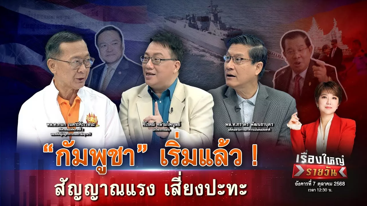 3 วันอันตราย ! เส้นตาย “หนองจาน” ปริศนา ติดปีกเรือรบ จีนเลือก “กัมพูชา” ? 00:11:55 จุดไหนที่มีการสู้รบ จุดนั้นมีครอบครัวทหารอยู่ 00:24:43 เป็น รมต.กลาโหม ของไทยไม่จำเป็นต้องพูดแทนจีน 01:01:26 ถ้าเราไม่ทำ กัมพูชา ยิ่งได้ใจ 01:07:09 นายกฯไฟเขียว ฝ่ายปฎิบัติจะชัดเจนมากขึ้น 7 ต.ค.68 เรื่องใหญ่รายวัน และ ออกอากาศช่องวัน 31 และแจ๊ค ศรีสุภางค์ เรายังคงเกาะติดเรื่องใหญ่ สถานการณ์ชายแดนไทย-กัมพูชา เพราะเหลืออีกเพียง 3 วัน จะถึงเส้นตาย 10 ต.ค. ต้องผลักดันชาวกัมพูชา ออกจากพื้นที่บ้านหนองจาน จ.สระแก้ว รวมถึงกรณีปราสาทอื่นๆ ที่มีการตั้งข้อสังเกตุว่าเป็นพื้นที่ที่ยังไม่มีการปักปันเขตแดน แต่สุดท้ายเป็นจุดร่วมที่ไทยเข้าไปใช้พื้นที่ไม่ได้ แต่ทหารกัมพูชาเข้าไปตั้งฐาน คนกัมพูชาเข้าไปเที่ยวได้ ร่วมพูดคุยกัย พล.ท.กนก เนตระคะเวสนะ อดีตรองแม่ทัพภาคที่ 2 และอดีตผู้บัญชาการกองกำลังสุรนารี / พล.ท.ภราดร พัฒนถาบุตร อดีตเลขาธิการสภาความมั่นคงแห่งชาติ และคุณศิโรตม์ คล้ามไพบูลย์ นักวิชาการอิสระ พล.ท.กนก วิเคราะห์กรณีที่มีการกังวลกันว่าปราสาทต่างๆของไทย จะถูกกัมพูชารุกเงียบยึดไป ซึ่งหากกางแผนที่ดูแล้ว จะเห็นว่าฝั่งกัมพูชายังอยู่ในจุดอธิปไตยของตัวเอง และไทยยังอยู่ในจุดอธิปไตยของไทย ยังไม่รุกล้ำ หลังการสู้รบก็ยังไม่มีใครเข้าใกล้จุดที่ยังไม่ปักปันเขตแดน เพียงแต่ฝั่งกัมพูชาเดิมเกมสร้างข่าวให้ไทยหวั่นไหว และทางกองทัพไทยก็ไม่ชี้แจงให้หนักแน่นพอ โดยเฉพาะท่าทีของทางผู้นำกองทัพ และรัฐมนตรีว่าการกระทรวงกลาโหม ที่ก่อนหน้านี้ดูมั่นคง แต่หลังรับตำแหน่งกลับดูแผ่วลง จนชาวบ้านเกิดความไม่มั่นใจ ด้านพล.ท.ภราดร เชื่อว่ากองทัพทำงานไม่แผ่ว แต่ต้องรอดูนโยบายรัฐบาล และปฏิบัติการทางทหาร จะเชื่อมกันหรือไม่ / ส่วนการพูดคุยทั้ง 2 ประเทศกลายเป็นว่าคนที่หงุดหงิดคือประชาชน และกรณีพิพาทไทย-กัมพูชา มาถึงจุดที่ต้องสถาปนาพื้นที่อย่างเด็ดขาด ต้องชี้ให้เห็นว่าไทยเหนือกว่ากัมพูชา จนกัมพูชาไม่เป็นภัยคุกคาม ด้าน อ.ศิโรตม์ มองกรณีที่มีการเปรียบเทียบระหว่างท่าทีของกองทัพภาค กับ กลาโหม ว่าทำไมท่าทีของ “บิ๊กเล็ก” รมว.กลาโหม ดูแผวเบา อย่างการให้สัมภาษณ์ต่างๆ ที่คนไทยฟังแล้วก็หงุดหงิดหลายเรื่อง เช่นกรณีที่จีนจะส่งอาวุธให้กัมพูชา จริงอยู่ที่อาจมีการตกลงล่วงหน้า แต่ความเป็นรัฐมนตรีกลาโหม ของไทย ไม่จำเป็นต้องพูดแทนจีน และก็ไม่จำเป็นต้องชี้แจงแทนกัมพูชา ท่านสามารถพูดแทนคนไทยได้ ความเป็นรัฐมนตรี ต้องพูดแทนประเทศไทย เพราะสิ่งที่บอกว่าทั้ง 2 ประเทศมีการตกลงกันมานา