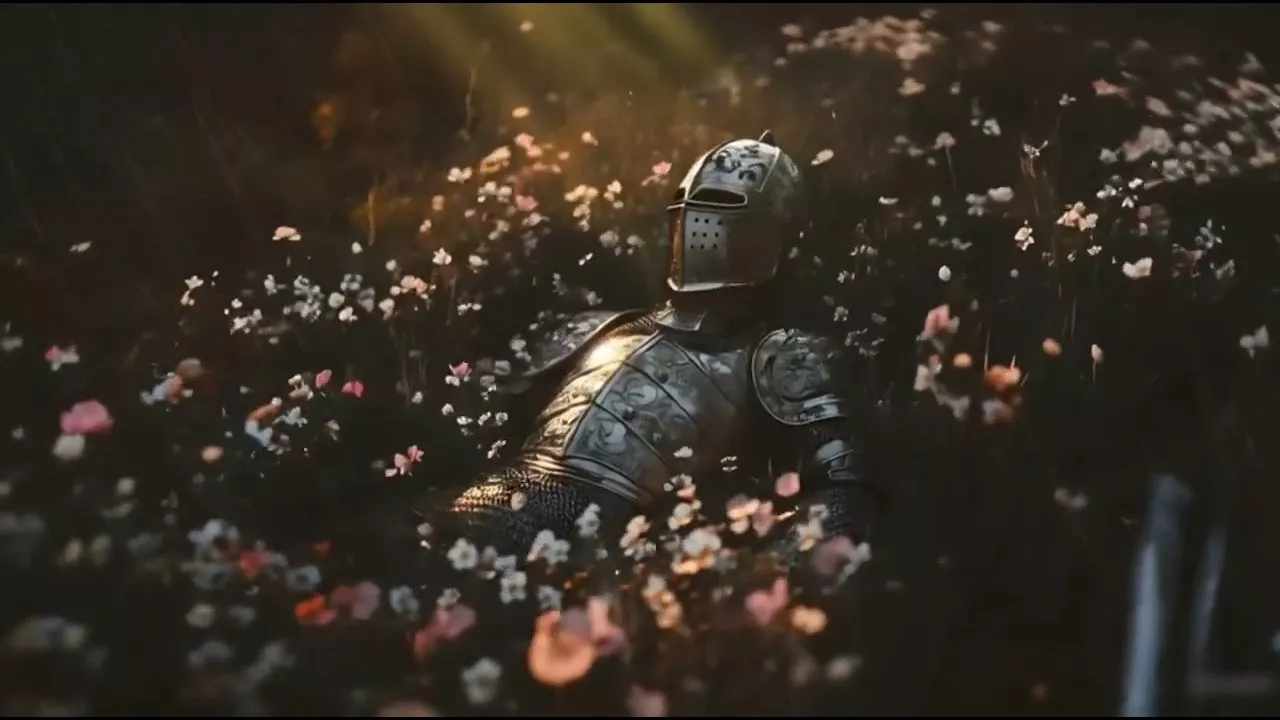 Рыцарь в доспехах лежит среди полевых цветов, окутанный мягким светом заходящего солнца. Тяжёлый металл его брони блестит под лучами, будто отражая последние мгновения прошедшей битвы или долгого пути. Вокруг — тишина, лёгкий дождь и живое дыхание природы, которая бережно принимает в свои объятия усталого воина. 🕊️ Погрузитесь в атмосферу меланхолии и красоты — там, где заканчиваются битвы и начинается вечный покой.