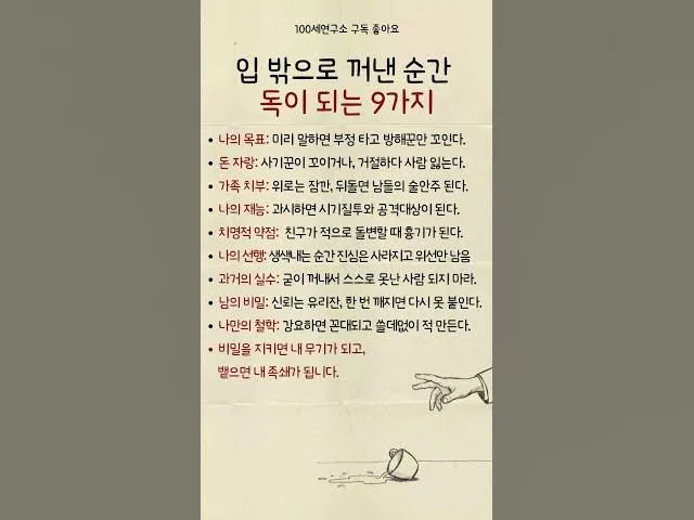 "그때 내가 그 말을 왜 했을까..." 사장님, 살면서 뱉은 말을 주워 담고 싶어 이불 킥한 적 없으신가요? 말은 쏟아진 물과 같아서, 한번 나가면 내 목을 겨누는 칼이 되어 돌아옵니다. 나이 들수록 입을 무겁게 하는 것이 나를 지키는 최고의 갑옷입니다. 돈 자랑, 자식 자랑, 남의 비밀... 순간의 기분에 취해 떠들지 마세요. 침묵할 줄 아는 사람이 진짜 무서운 고수이고, 끝까지 존경받는 어른입니다. 오늘부터 이 9가지는 무덤까지 가져가십시오. 내 인생이 편안해집니다. #처세술 #탈무드 #지혜 #침묵의힘 #5060세대 #노후준비 #자기계발 #마인드셋 #화술 #인맥관리