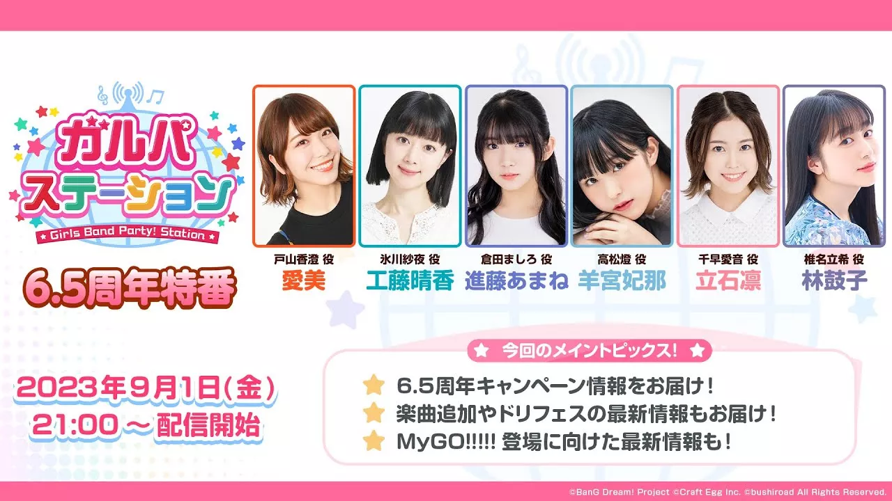 スマートフォンゲーム『バンドリ! ガールズバンドパーティ!』の公式情報番組「ガルパステーション」を放送します! 「ガルパステーション」は、「バンドリ! ガールズバンドパーティ!」の出演キャストと共に、ゲームの最新情報やガルパに関する最新情報をお届けする番組です。 今回は6.5周年キャンペーン情報や、楽曲追加やドリフェスの最新情報、MyGO!!!!!登場に向けた最新情報など、様々なガルパの最新情報を発表予定です! ぜひご覧ください✨ ■日時 2023年9月1日(金) 21:00~予定 ■今回のメイントピックス! ・6.5周年キャンペーン情報をお届け! ・楽曲追加やドリフェスの最新情報もお届け! ・MyGO!!!!!登場に向けた最新情報も! ■出演 愛美(戸山香澄 役) 工藤晴香(氷川紗夜 役) 進藤あまね(倉田ましろ 役) 羊宮妃那(高松燈 役) 立石凛(千早愛音 役) 林鼓子(椎名立希 役) ※MyGO!!!!!キャストはMyGO!!!!!パートのみのご出演です ※番組の予定は予告なく変更する場合がございます。 ※本番組は出演キャスト、及びスタッフの安全面に十分配慮した上で実施いたします。 ※本番組はチャット投稿に関して制限があります。