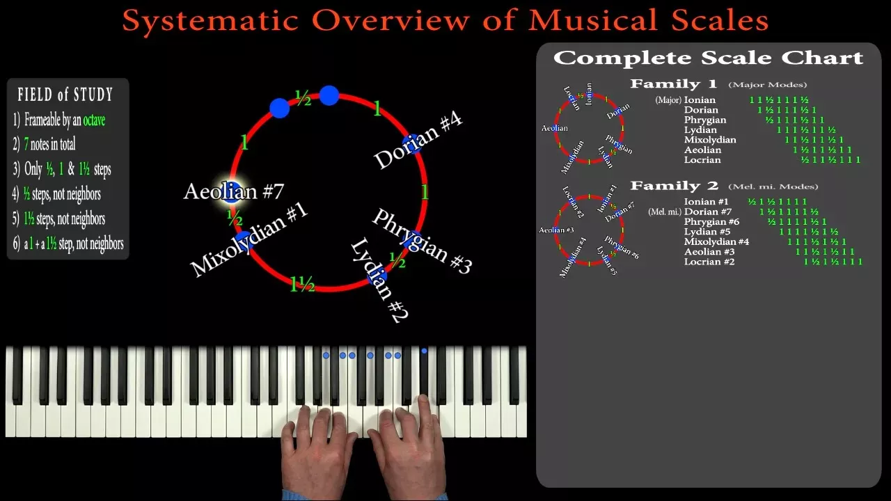 We’ll create a simple, outstanding and consistently systematic overview of musical scales. First we’ll define our field of study. Then we’ll do a methodical scale walkthrough and draw our simple overview scale chart. And finally, if you're interested, we'll discuss some geeky music theory stuff about the methods in use and the preconditions of our simple scale overview chart. In many ways, this new more simple way of systemizing scales is quite revolutionary. We’ll cut off the nonsense, so to speak, and we’ll understand musical scales in a more free, liberating way more suited for the analysis of modern NewJazz Music. I’ve made the scale overview chart from this video on a simple one page PDF - I hope you'll find it useful :) https://newjazz.dk/Compendiums/Systematic_Scale_Chart.pdf I've made another similar jazz tutorial about musical scales. The lesson is not as systematic and geeky as this one. It’s more practical. For example we use the scales to improvise on 2-5-1 chord progressions. https://www.youtube.com/watch?v=Vq2xt2D3e3E I’ve also made another jazz lesson about the Family 1 scales in particular and we learn to recognize the musical scales by how they actually sound. https://www.youtube.com/watch?v=KiEoJjWlGMY Translations of the English subtitles to Spanish, Portuguese, Italian and French by Edgardo Solano from Colombia. Thank you so much Edgardo!!! You can turn on the subtitles and choose a language in the video settings. All NewJazz lessons are free, public and for everybody. I have no sponsors and I sell no merchandise. I'm just little me trying to make Music the EPIC CENTER of everything! If you want to help me keep going you are so much welcome to make a small voluntary donation at either PayPal https://www.paypal.com/paypalme/NewJazz or Patreon https://www.patreon.com/cw/newjazz You can also just give me a nice like - moral support is also great support!!! Thank you so much :) :) :) Many warm regards from Oliver Prehn University Master degree in Music & Multimedia https://www.newjazz.dk/ Musical Scale Lesson Index: 00:00 Intro 01:25 Field of Study 03:09 Scale Walkthrough - Family 1 06:47 Scale Walkthrough - Family 2 11:50 Scale Walkthrough - Family 3 15:47 Scale Walkthrough - Family 4 21:17 Geeky stuff - Scale vs Mode 26:40 Geeky stuff - Alterations 35:32 Geeky stuff - Enharmonic Names 38:22 Outro