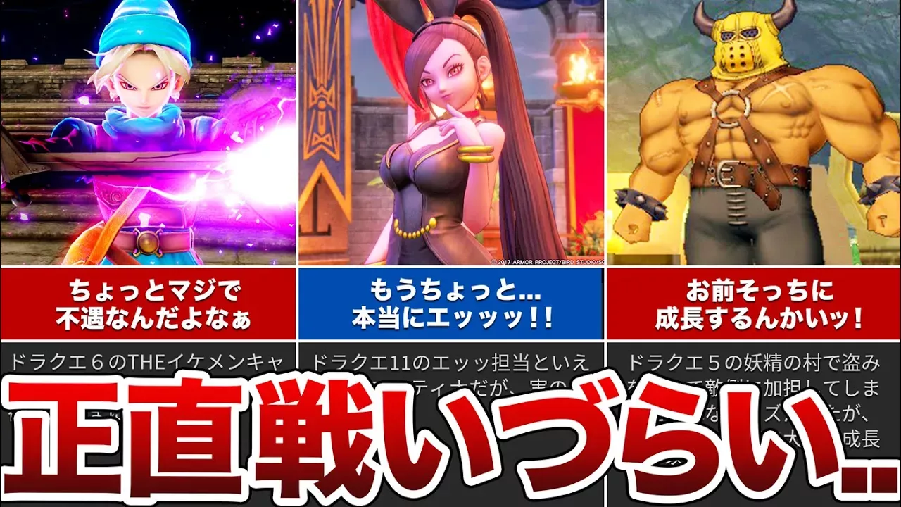 歴代ドラゴンクエストの正直戦いづらいと感じてしまう背景を持つボスを紹介する動画です! ▼公式Twitterアカウントです!もしよければフォローお願いします(^^) https://twitter.com/akiira_DQmame 今回もスラオ&アキラがバシバシドラクエ談義を交わしていきますっ(^^) ぜひゆっくりしていってくださいー^^ この動画で利用している株式会社スクウェア・エニックスを代表とする共同著作者が権利を所有する著作物及びスギヤマ工房有限会社が権利を所有する楽曲の転載・配布は禁止いたします。 (C) ARMOR PROJECT/BIRD STUDIO/SQUARE ENIX All Rights Reserved. (C) SUGIYAMA KOBO (P) SUGIYAMA KOBO