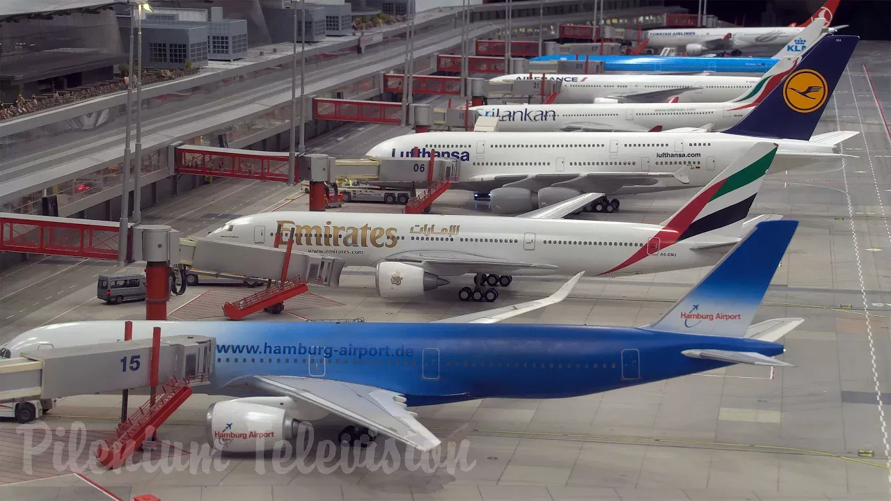 В этом видео мы смотрим не на мир моделей поездов, а на крошечный мир авиации и авиамоделей. Сегодня мы открываем для себя самую большую в мире модель аэропорта. Это действующая модель аэропорта, когда-либо построенная в масштабе 1/87. Мы находимся в великом музее Miniatur Wunderland в Гамбурге, Германия. Полюбуйтесь на чудеса авиационной и инженерной мысли. Многие посетители Миниатюрной страны чудес восхищаются тем, что создателям макета удалось сделать полностью рабочий аэропорт. Аэропорт строили больше пяти лет, так что посетители макета смогут найти здесь много интересного и увлекательного. Турбины уже работают, и самолет Airbus A380 готовится к вылету. Эта модель крупнейшего в мире пассажирского самолета имеет 79,8 см в размахе крыльев и оборудована 134 светодиодными лампочками. Все выполнено очень детально: вы увидите следы шин на полосе, ветрогасители для защиты багажных тележек от воздушных потоков, космический шаттл, Конкорд и даже садящееся НЛО. Телетрапы движутся автоматически, точно подъезжая к месту посадки. Перемещение самолетов по земле контролируется инфракрасными датчиками, расположенными сверху. *Miniatur Wunderland* https://www.miniatur-wunderland.com *Pilentum Television* https://www.pilentum.de *Airport Video 2013* https://www.youtube.com/watch?v=V36iEm-5vcE *Airport Video 2016* https://www.youtube.com/watch?v=TJF3I1gmTvQ *Airport Video 2023* https://www.youtube.com/watch?v=2IkweiUa0qg *Google Maps* https://www.google.com/intl/ru/maps/about/behind-the-scenes/streetview/treks/miniatur-wunderland/#airport