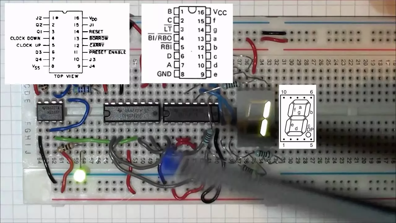 This part connects the BCD Counter (40192) and 555 Timer circuits designed in a previous experiment to the 74LS47 BCD to 7-Segment Display. This experiment shows a working Decimal Counter (0 to 9). The details of this experiment are at: www.eeng.dcu.ie/~molloyd/EE223