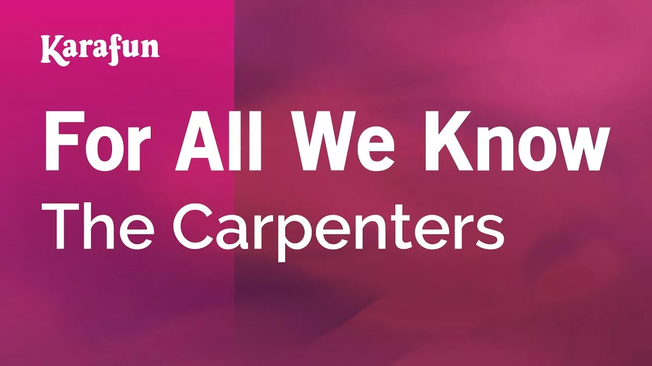 You wish to organize the best karaoke party? 💻 📱📺 https://app.karafun.com/cKyd/youtube Try KaraFun App, available on all devices. Unlimited high-quality songs // Control vocals and instrumentals // Karaoke + Music Games included // Use your phone as a remote via QR code: send photos, explore catalog // No ads Or download MP3 👉 This version contains a low-volume vocal guide to help you learn the song. The karaoke version without the vocal guide is available on https://www.karafun.com./ This recording is a cover of For All We Know as made famous by The Carpenters. This version is not the original version and is not performed by The Carpenters. This instrumental/playback version contains a vocal guide, the lyrics, and backing vocals. All the assets on KaraFun channels are used by permission under licensing agreement with rights holders (music composition, sound re-recording).