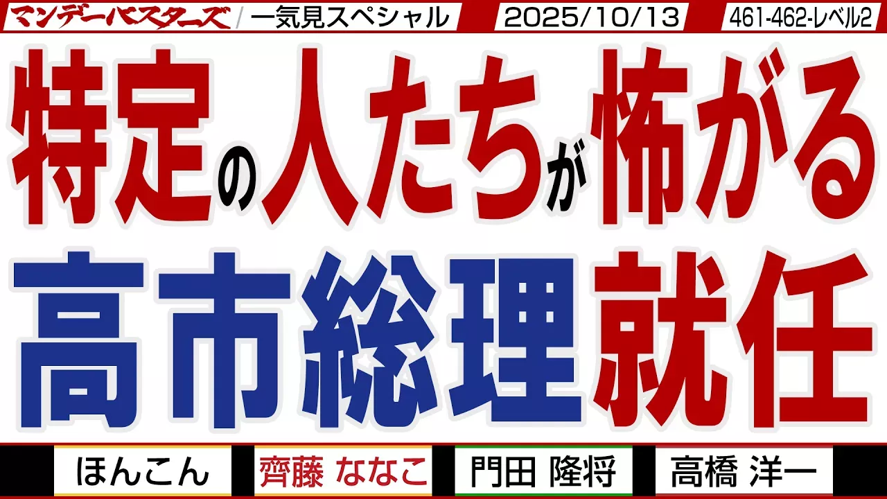 マンデーバスターズ・文化人スペシャル/一気見版 ━━━━━━━━━━━━━━━━━━━━━ 【出演者】順不同 #ほんこん (タレント/130R) #門田隆将 (作家/ジャーナリスト) #高橋洋一 (嘉悦大学教授/数量政策学者) #齊藤ななこ (フリーキャスター) ━━━━━━━━━━━━━━━━━━━━━ ★当チャンネルに関する諸問題への対応は、文化人放送局の顧問法律事務所を通して対応します。 ━━━━━━━━━━━━━━━━━━━━━ 太平洋戦争末期、尖閣諸島で起きた悲劇 人々を救ったのは、真水をたたえた日本の領土 『尖閣1945』映画化プロジェクト https://www.furusato-tax.jp/gcf/3674?srsltid=AfmBOoq4TGWIYYizo_1mcCmcSxLJAedlHlBR2vNGJ-8k6lf9-6CHyZFn ━━━━━━━━━━━━━━━━━━━━━ 高市早苗選挙区事務所 奈良県大和郡山市筒井町940-1 TEL 0743-57-5050 FAX 0743-57-5151 ご入党のお願い https://www.sanae.gr.jp//joinldp.html URL https://www.sanae.gr.jp E-mail st-nara@m4.kcn.ne.jp ━━━━━━━━━━━━━━━━━━━━━ 西村幸祐さんのメルマガ 週刊西村「ニュースの読み方」 https://kohyu1952.theletter.jp/about ━━━━━━━━━━━━━━━━━━━━━ 【お知らせ】 ①【ダイヤモンドクラブ】とは、様々な動画や配信がご視聴可能! 「YouTube有料コンテンツ」や「独自配信コンテンツ」がご視聴可能です! 【文化人独自取材】安倍元総理銃撃事件ドキュメンタリー映像も視聴可能 ご登録お願いいたします。 https://bunkajintv.com/subscription/ https://bunkajintv.com/membership/diamond-mov/monday-b/ ②【YouTubeメンバーシップ会員】のご登録 一般公開ライブの続き、一般配信ができない動画をライブ配信 チャットしながらご視聴をお楽しみいただけます! https://www.youtube.com/channel/UC7dXPammhcS6lrPzgq7WAPQ/join ③スタジオ観覧チケット一覧。銀座スタジオで生ライブをドリンク飲みながら! https://bunkajintv.com/column/ ④制作応援支援のお願い https://bunkajintv.com/support/ ⑤スポンサー募集 https://bunkajintv.com/sponsor/ ━━━━━━━━━━━━━━━━ 【文化人放送局オフィシャルサイト】 https://bunkajintv.com/ 【X】 文化人放送局 https://twitter.com/Bunkajin_tv 洋一の部屋 https://twitter.com/yoichinoheya マンデーバスターズ https://twitter.com/mondaybusters かようライブ https://twitter.com/ikarerusuri_men 文化人デジタル瓦版 https://twitter.com/aikokuyonzyushi ザ・Q&A https://twitter.com/theQandA111 渡邉哲也show https://twitter.com/tetsuyashow ウィークエンドライブ https://twitter.com/weekendlive1111 【Facebook】 https://www.facebook.com/unsupportedbrowser 【関連Youtubeチャンネル】 文化人放送局2 https://www.youtube.com/@bunkajintv2 洋一の部屋 https://www.youtube.com/@youichinoheya マンデーバスターズ https://www.youtube.com/@Monday_Busters 山口インテリジェンスアイ https://www.youtube.com/@intelligenceeye 文化人デジタル瓦版 https://www.youtube.com/@bunakjin_kawaraban The Q&A https://www.youtube.com/@bunkajintheQandA 渡邉哲也show https://www.youtube.com/@watanabetetuya-show ウィークエンドライブ https://www.youtube.com/@bunkajinweekend Gohei Nishikawa https://www.youtube.com/@goheinishikawa9381 文化人ミュージック https://www.youtube.com/@GINZA7thStudio 文化人スポーツ https://www.youtube.com/@bunkajintv_sports 【コンサート情報】 https://bunkajintv.com/ginza7/ 【お問い合わせ】 official@bunkajintv.com このスペシャルの小見出しは… 〇YouTuberの門田さんとまた負傷した洋一さんとオープニングトーク 〇安倍総理も出来なかった公明切りを完遂した高市総裁 〇マスコミの都合の良い数合わせに洋一さんが物申す 〇いまいち信用ならない国民民主の玉木代表 〇仲たがいした民主党の方々 野合でまた民主党の悪夢を招く 〇中国共産党の言いなりの公明党はどうする? 〇自民党で造反を企む輩達 でも自民党除名が待ってますよ 〇公明斉藤代表の嘘が明白に 中共からの指令でしょう? 〇嘘がつけない小〇党の公明斉藤代表 〇特大ブーメラン 自身が裏金議員だった公明斉藤代表 〇これで弁護士? 政治センス皆無の橋下徹氏 スパイ防止法がそんなに怖い? 〇比較対象が橋下氏だからまともに見えた裏金公明斉藤代表 〇スパイ防止法が制定されなければ戻る気満々の裏金公明斉藤代表 〇高市早苗氏とスパイ防止法が恐ろしいから下げたい橋下氏 〇野村氏 公明党が良ければ公明党の人になってしまいなさい 〇中共の手足だった公明党が連立離脱 親中政権を望む中共の足掻き 〇敵に塩も砂糖も与える石破総理の所感 本当に愚宰相 〇尊び敬う心は内にあり 何時でも祈る心が重要 〇保守安定を狙い巧みな党内人事の高市総裁 〇秘書給与詐取で有罪判決の辻本議員が萩生田氏議員に何を言う? 〇ラスボス宮澤洋一氏の上に後輩の小林氏を配置 プライドが… 〇ただ単に麻生は優遇の人事ではない 保守をまとめるための人事 〇洋一さんが財務省の無駄に高いプライドを解説 〇高市総理誕生を力ずくでも阻みたい反日の勢力 〇国民民主玉木代表に日本の舵取りを任せられますか? 〇政権交代のために日本国民を路頭に迷わせても構わない立憲野田代表 〇日本国民の為を思えば立憲とは組めないのは明白 真っ当な国民民主 〇