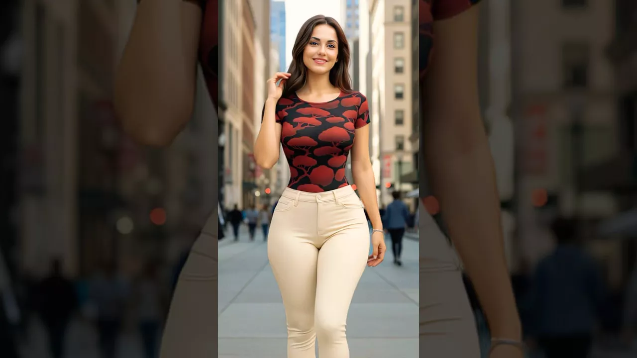 Hey, my sweet friends! 👋 Brooke here 🙋♀️, ready to share today's outfit, perfect for a chic-but-comfy city day! 🏙️✨ I wanted something with personality, and this combo totally delivers. 🔥 I'm rocking this amazing fitted body suit 🤩 – it’s short-sleeved, scoop neck and back, with a black base and a really cool, abstract red pattern. ❤️🖤 It looks like Japanese Bonsai trees 🌿, giving it such a unique vibe! 🌟 I pulled on my high-waisted, skinny jeans in a lovely light cream. 👖🤍 They’re super flattering and create a beautiful contrast with the bold top, don't you think? 😉 For accessories, I kept it simple with just a delicate silver bracelet. ✨ When your top is this eye-catching 👀, minimal jewelry really lets it shine! 💫 You could easily swap 🔄 the jeans for a black midi skirt for dressier vibes 👠, or add crisp white sneakers for comfort. 👟 A black denim jacket would look fab, too! 🧥 Find similar patterned tops at boutiques 🛍️, and cream jeans at Old Navy or H&M. What are your thoughts? 👇💬