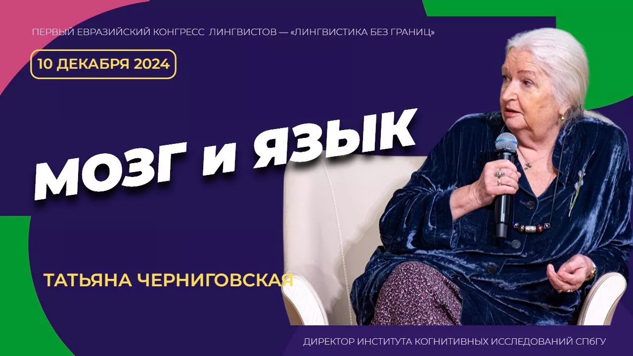 «Лингвистика без границ» — под таким девизом с 9 по 13 декабря в Москве прошел Первый Евразийский конгресс лингвистов. Масштабное международное научное событие объединило свыше 500 учёных из 46 стран. В рамках конгресса были представлены ключевые направления развития современной лингвистики и ведущие мировые научные школы. Для широкой аудитории в рамках конгресса провели публичные дискуссии по общественно значимым лингвистическим темам. Среди ярких выступлений была лекция «Мозг и язык» академика РАО, директора Института когнитивных исследований СПбГУ Татьяны Черниговской. Она рассказала, что важно знать о деятельности человеческого мозга для понимания языка как сложнейшей системы. Москва, 10 декабря, Библиотека им. Н. А. Некрасова Эксперт: Татьяна Владимировна Черниговская (доктор биологических наук, доктор филологических наук, профессор, академик РАО, директор Института когнитивных исследований СПбГУ). «Что такое язык? Мозг и язык. Язык — это средство мышления». Татьяна Черниговская ТАЙМ-КОДЫ: 00:20 Введение в когнитивную науку 03:46 Когнитивная наука и её мультидисциплинарность 06:30 Что такое язык? 10:10 Человек и его способности 14:00 Создание миров 16:00 Язык и его восприятие 16:47 Комиксы и восприятие литературы 19:32 Исследование мозга и его сложность 21:56 Структура языка 24:02 Продуктивность языка 25:53 Семантика и грамматика 26:53 Генетическая способность к языку 28:16 Виртуальный учебник языка 30:04 Артикуляция и структура языка 31:59 Исследования фонем у животных 33:15 Проблемы в исследованиях фонем 35:19 Бесконечность и человеческая глупость 36:09 Способность к языку у детей 38:06 Лингвистические споры 39:56 Ген языка FOXP2 41:54 Критика теории гена языка 42:51 Специфические языковые нарушения 44:32 Ген FOXP2 у животных 46:12 Введение в тему 47:02 Косвенные признаки и попугаи 49:04 Интеллект животных 51:03 Генетические исследования 53:02 Символическое мышление и иерархия 54:54 Поведение животных и их интеллект 58:17 Искусственный интеллект и будущее 01:01:08 Заключение и вопросы 01:01:55 Мозг и язык 01:03:55 Математический и музыкальный языки 01:07:06 Искусство и его происхождение 01:10:22 Телепатический обмен 01:15:10 Индивидуальность и успех