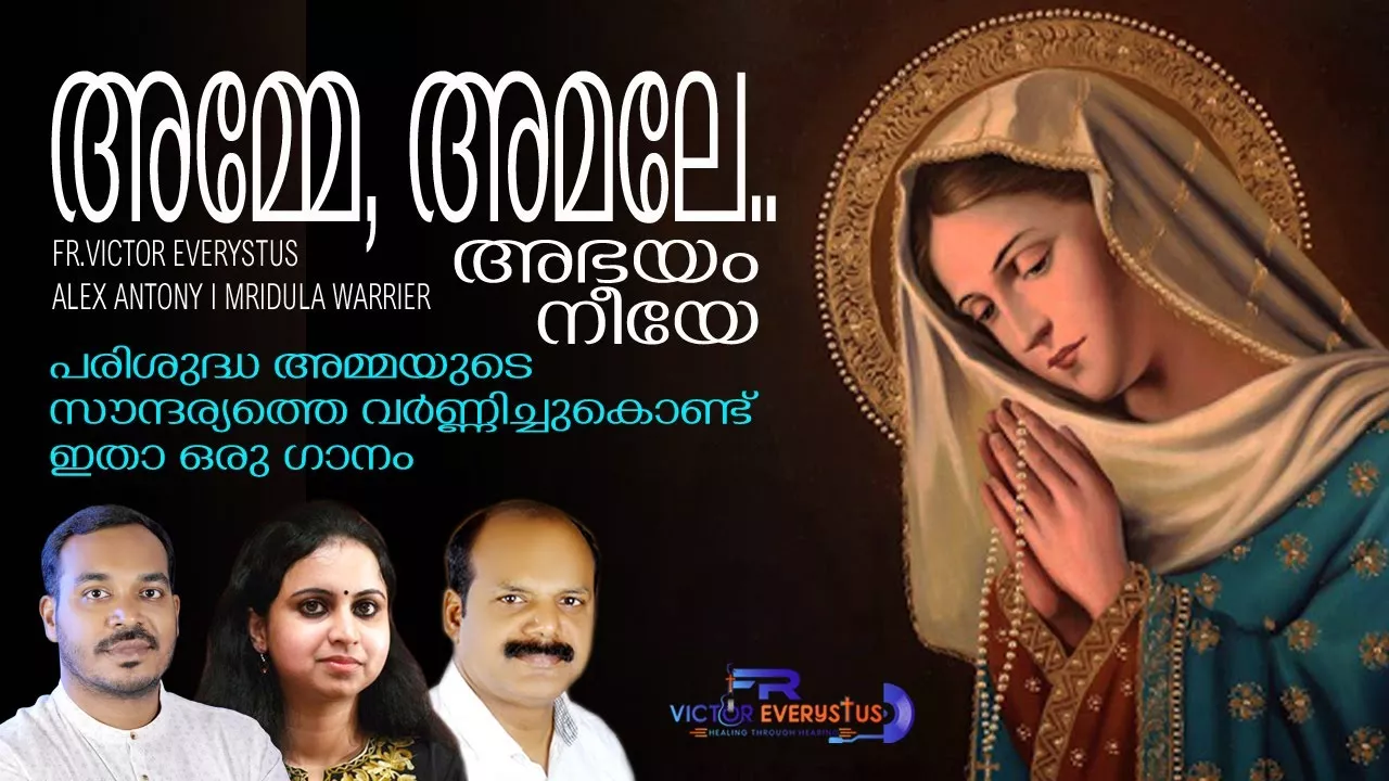 MINUS TRACK : https://www.youtube.com/watch?v=5vM2hyp7ojw LYRICS : FR.VICTOR EVERYSTUS MUSIC : MR.ALEX ANTONY ORCHESTRATION : PRADEEP TOM SUNG BY : MRIDULA WARRIER PRODUCTION : KOSHY EVERYSTUS 02/2017 RHYTHM PROGRAMMING : THOMAS KURUMASSERY & BINEESH VIOLIN : FRANCIES XAVIER, JOSEKUTTY, JAIN & FRANCIS VEENA : BIJU SAX,FLUTE & MELODICA : RAJESH CHERTHALA BASE GUITAR : JUSTIN THABALA & DOLAK : ANAND SOLO VIOLIN : FRANCIES XAVIER HARMONY : ANOOP, GAGUL JOSEPH, WILLIAM JOSEPH, ALEX ANTONY, ABIN SABU, MERLIN, RINCY, MABLE & SIJI. EDITING : GEORGE, MAGIC FRAME SPECIAL GRATITUDE TO : VERY.REV.FR.JOSEPH THANNIKOT (M.M.I.C.) FOR MORE DETAILS : divinesarigama@gmail.com അമ്മേ...അമലേ... അഭയം നീയേ, വിമലാംബികേ...(2) കൺമുൻപിൽ നീയൊരു സ്നേഹകാവ്യം, കൂരിരുളിൽ... കണ്ണീർ താഴ്വരയില് ... എളിയോർക്കെന്നും നീ നീതിസൂര്യൻ. (അമ്മേ...അമലേ...) കോറസ്സ്: ദാവീദിൻ കോട്ടയെ കനകാലയമേ, വാഗ്ദാനപേടകമേ നീ വാഴ്ക.. സ്വര്ഗ്ഗത്തിൻ വാതിലേ ഉഷ താരമേ, പാപിതൻ സങ്കേതമേ വാഴ്ക വാഴ്ക.. കനിവേറും നിൻ പൂന്തോപ്പിലെ, കതിരിടും പനിനീർ പൂവല്ലേ ഞാൻ.. (2) കൈവെടിയല്ലേയീ പാപികൾ ഞങ്ങളെ..(2) കാരുണ്യക്കച്ചയാൽ പൊതിയേണമേ, പൊതിയേണമേ.. (ദാവീദിൻ..) കന്മഷ മാനസ കൽഭരണികളിൽ, കാനായിലെ പുതുവീഞ്ഞു നിറയ്ക്കേണമേ, (2) ജീവിതമാമീ കാൽവരിക്കുന്നിലെ.. (2) കുരിശുകൾ പേറാൻ തുണയേകണെ, തുണയേകണെ.. (അമ്മേ...അമലേ...+ ദാവീദിൻ) SOME FAVOURITE HITS OF FR.VICTOR EVERYSTUS ENTRANCE SONGS MANASSUKALE UNARU https://www.youtube.com/watch?v=M1Jj38jqM5s SNEHA DEEPAM https://www.youtube.com/watch?v=k9bYhgGJO9w Minus: https://www.youtube.com/watch?v=QxuTusOuoBE AADHI CHAITHANYAME https://www.youtube.com/watch?v=WFYId3ZWaXU Minus: https://www.youtube.com/watch?v=p_KZvC2qa9E LA CHIESA (AMODHA GANAM) https://www.youtube.com/watch?v=sKhUFxmrG4g Minus: https://www.youtube.com/watch?v=FNuz15ZlPag ALTHARATHAN THANALIL https://www.youtube.com/watch?v=rQk6hjMLGJM Minus: https://www.youtube.com/watch?v=2f-MR5Onkeo PSALMS JANATHAKALE KARTHANE https://www.youtube.com/watch?v=aUHWKJLP1Uw Minus: https://www.youtube.com/watch?v=j7D-YR2kR3k ATHYUNNATHANAM DHAIVAME https://www.youtube.com/watch?v=fnnaJIq74Xw Minus: https://www.youtube.com/watch?v=L7zGEhT1Ook ENTE DHAIVAM https://www.youtube.com/watch?v=en1l1Jj9HVA Minus: https://www.youtube.com/watch?v=OMGunoXaanU OFFETRY SONGS EE YAAGA VEDHIYIL https://www.youtube.com/watch?v=sliONkhXbvg Minus: https://www.youtube.com/watch?v=P07HYQ-OY34 KUMILAPOL KSHENIKAM https://www.youtube.com/watch?v=KSHydHQkUjg Minus: https://www.youtube.com/watch?v=n5yp00va9dU (Flute): https://www.youtube.com/watch?v=6WyJKeJ1OQY ALIVULLA DHAIVAME https://www.youtube.com/watch?v=5vRUiWJBtQg Minus: https://www.youtube.com/watch?v=sP4NMsu5HoQ BELIYAI ALIYAN (M) https://www.youtube.com/watch?v=KDPOCQribSc (F) https://www.youtube.com/watch?v=njALubl_FzM (V) https://www.youtube.com/watch?v=eULVsn52WnY Minus: https://www.youtube.com/watch?v=gaueoH0e9vk JEEVITHA THALAVUM https://www.youtube.com/watch?v=uBaiLQjf62I Minus: https://www.youtube.com/watch?v=MGyrVScp5Tw DHAIVASNEHAM https://www.youtube.com/watch?v=Jbk622E-c7M URUKIYA MANAMODE (BURRIAL) https://www.youtube.com/watch?v=0GK-g9cEV04 COMMUNION SONGS OSTHITHAN ROOPAMAI https://www.youtube.com/watch?v=KGtPkkYmxlk Minus: https://www.youtube.com/watch?v=0zmHabq6_vQ ATHAZHA MESAYIL https://www.youtube.com/watch?v=va6DZj62iAg Minus: https://www.youtube.com/watch?v=ZfnqRBmtwjM SWARGA KAVADAM https://www.youtube.com/watch?v=eA9W0UZLtQw KADALOLAM NALKUM https://www.youtube.com/watch?v=E8fVeEAySYU Minus: https://www.youtube.com/watch?v=aCLEfkwGLUg ATHULYAM ANANTHAM https://www.youtube.com/watch?v=EGm7Di7LDgc KOODE NADANNAVAN https://www.youtube.com/watch?v=V4M5rnK7WvA Minus: https://www.youtube.com/watch?v=4LlNPpgY9bc OH ENTE DHAIVAME https://www.youtube.com/watch?v=y3inHSXWY4M (f) https://www.youtube.com/watch?v=AlQKxs8EwO4 Minus: https://www.youtube.com/watch?v=ZwgKrTANuz0 SWARGEEYA MANNAYAI https://www.youtube.com/watch?v=X_8VJegVtcs MARIAN HYMNS Santa Maria (Holy Mary) https://www.youtube.com/watch?v=zazZjL-p8ps Minus: https://www.youtube.com/watch?v=bOUJqoXqiFs MIZHI NEERIL https://www.youtube.com/watch?v=IWSebaH6c68 AMME AMALE https://www.youtube.com/watch?v=vuJI1ODeGBE HOLY WEEK THIRUKURISIL NINNUM (AGNUS DEI) https://www.youtube.com/watch?v=8sTQaxYd1lA Minus: https://www.youtube.com/watch?v=hLH4uxsmPMs VIA SACRA (YAATHRAA YATHRAA) https://www.youtube.com/watch?v=OOucZIHbqwI Minus: https://www.youtube.com/watch?v=8ae1W9yxoOw NINAMOZHUKUM https://www.youtube.com/watch?v=pYY2wDiaa6w Minus: https://www.youtube.com/watch?v=DJ7z3BLI31o NOMBARA THEEJWALAYAI https://www.youtube.com/watch?v=fIbItHZvVb4 Nagari Kanikkal: Minus: https://www.youtube.com/watch?v=mLZdusWMogk ADORATION HYMNS Totus Tuus (Totally Your's) https://www.youtube.com/watch?v=oBDz4g-XxMU Minus: https://www.youtube.com/watch?v=gsEPd00_wow AARADHANA AARADHANA https://www.youtube.com/watch?v=8FBCiEN8TtY Minus: https://www.youtube.com/watch?v=1qjn6TDoFlw CONSOLING SONGS Kannukal Nalkiya Nalla Dhaivam https://www.youtube.com/watch?v=XwXQz3klBIc Minus: https://www.youtube.com/watch?v=CU30QcvbGtc KARAYARUTHE https://www.youtube.com/watch?v=i5sk0JqTQf4 HRIDHAYAM MURIYUNNU https://www.youtube.com/watch?v=wZKKBvIxIBQ Minus