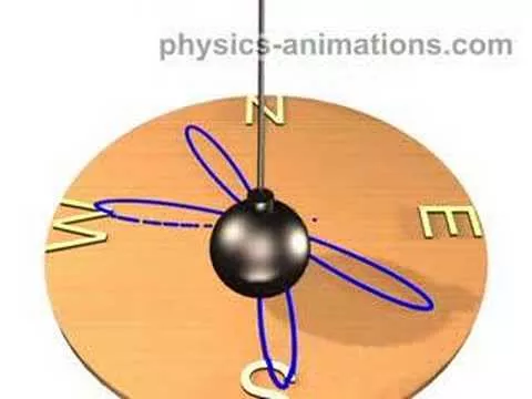 Last year when scientists mounted a pendulum above the South Pole and watched it swing, they were replicating a celebrated demonstration performed in Paris in 1851. Using a steel wire 220 feet long, the French scientist Jean-Bernard-Léon Foucault suspended a 62-pound iron ball from the dome of the Panthéon and set it in motion, rocking back and forth. To mark its progress he attached a stylus to the ball and placed a ring of damp sand on the floor below. The audience watched in awe as the pendulum inexplicably appeared to rotate, leaving a slightly different trace with each swing. Actually it was the floor of the Panthéon that was slowly moving, and Foucault had shown, more convincingly than ever, that the earth revolves on its axis. At the latitude of Paris, the pendulum's path would complete a full clockwise rotation every 30 hours; on the Southern Hemisphere it would rotate counterclockwise, and on the Equator it wouldn't revolve at all. At the South Pole, as the modern-day scientists confirmed, the period of rotation is 24 hours. The swing of Foucault's pendulum depends on the way we set it into the motion. If we set the pendulum in motion by a short push at the position of equilibrium it will swing as it is shown in animation. Actually the speed of the pendulum in the extreme positions is the speed of the earth rotation in the point of observation. When we set the pendulum in motion by a short push at the position of equilibrium it will swing as it is shown in the second animation. Actually the speed of the pendulum in the extreme positions is the speed of the earth rotation in the point of observation. http://physics-animations.com/