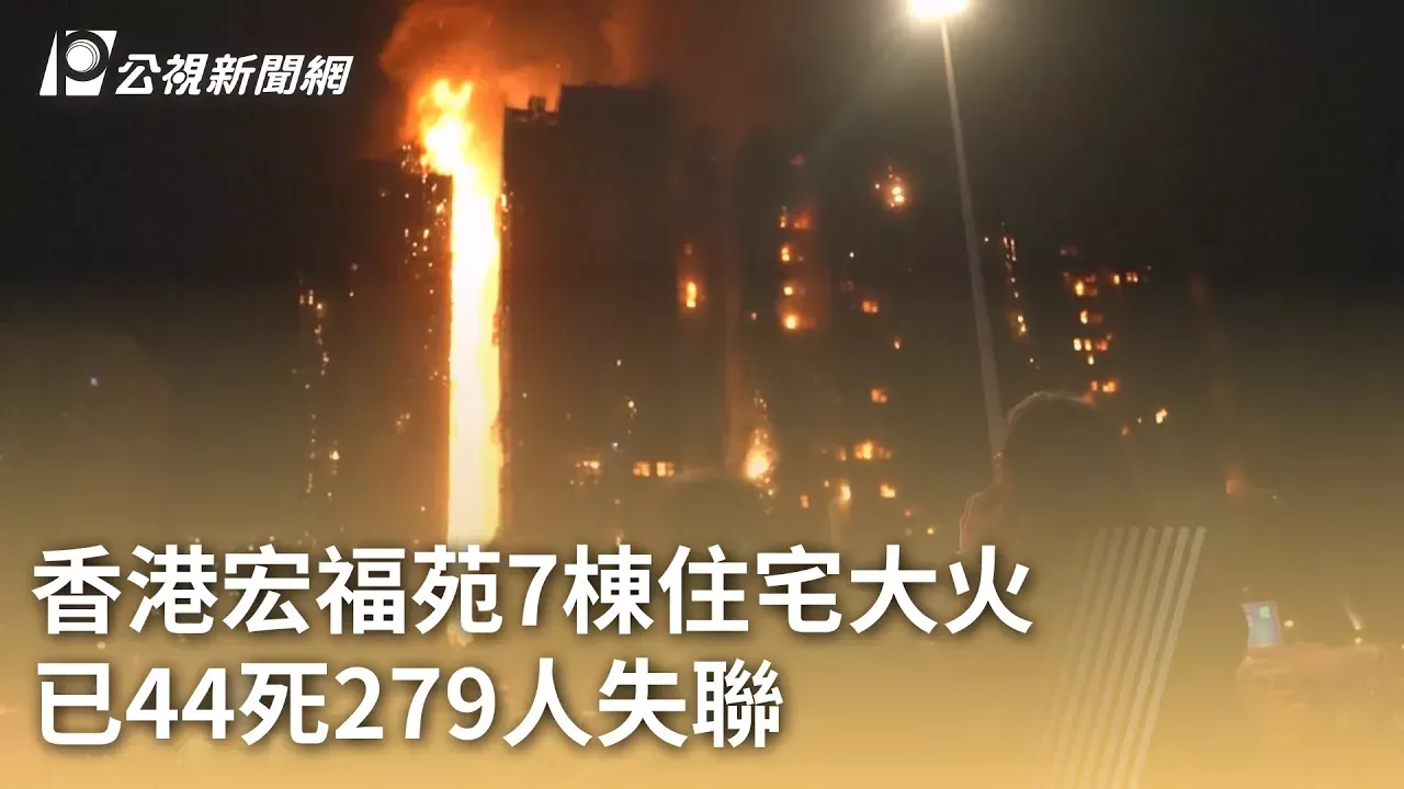 香港昨(26)日下午發生重大火災,位於新界北區的住宅大埔宏福苑,有7棟住宅發生大火,目前已知至少44死、數十人送醫,還有279人失聯。行政長官李家超表示,火勢正逐漸控制,其中3棟大樓已無明顯火光;當局指出火勢蔓延速度異常的快,已展開調查。 詳細新聞內容請見【公視新聞網】 https://news.pts.org.tw//article/783182 - 由台灣公共電視新聞部製播,提供每日正確、即時的新聞內容及多元觀點。 因網路播映權限制,完整版影片內容可能與電視版略有不同。 ■ 按讚【公視新聞網FB】https://www.facebook.com/unsupportedbrowser ■ 訂閱【公視新聞網IG】https://www.facebook.com/unsupportedbrowser ■ 追蹤【公視新聞網TG】https://t.me/PTS_TW_NEWS ■ 點擊【公視新聞網】https://news.pts.org.tw