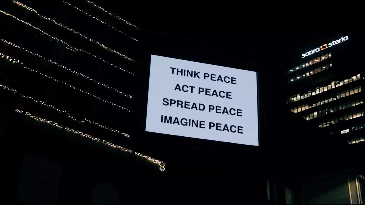 Monday morning, people rushing to work in Oslo, Norway, got a little break from the November darkness: 30 children from The Norwegian Girls Choir perfomed John Lennon’s “Imagine” in front of a large poster with peace messages from Yoko Ono: The campaign is a collaboration between Yoko Ono's studio, Clear Channel and the Nobel Peace Center, and takes place in connection with the Peace Center opening an exhibition of Yoko Ono's work on 1 December. Read more about the campaign: https://www.nobelpeacecenter.org/en/news/yoko-ono-s-peace-messages-light-up-norwegian-cities Visit the exhibition from 2 December: https://www.nobelpeacecenter.org/en/exhibitions/yoko-ono-peace-is-power