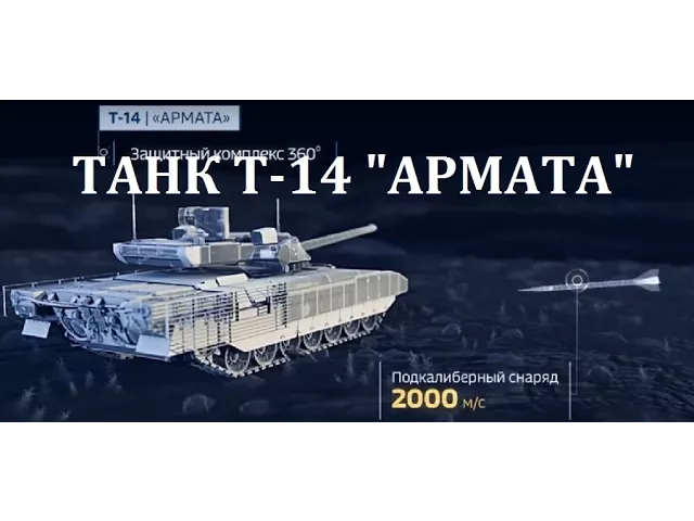 Т-14 (Объект 148) — новейший российский основной танк с необитаемой башней на базе универсальной гусеничной платформы «Армата». Он является первым в мире серийным танком, реализующим в своём конструкторском замысле концепцию «сетецентрической войны», где Т-14 используется прежде всего как машина разведки, целеуказания и корректировки огня САУ, ЗРК и эскорта из танков Т-90 своего тактического звена. Танк имеет круговой доплеровский АФАР радар средней дальности, ультрафиолетовые HD-камеры наблюдения с круговым охватом на 360°, способные детектировать работу двигателей техники по выхлопу из ионизированного газа.Танк также способен запускать беспилотный аппарат разведки и целеуказания «Птеродактиль» с собственной обзорной РЛС и инфракрасным прицелом. БПЛА запускается на кабеле, поэтому за счет электроэнергии из танка может неограниченно долго следовать за ним. Передача данных по кабелю защищает БПЛА от РЭБ. «Птеродактиль» позволяет танку вести огонь с закрытых позиций или находясь внутри облака маскирующей аэрозоли "Афганита", а также передавать разведанные цели другим машинам по ЕСУ ТЗ. Т-14 является «стелс-танком» с кардинальным снижением видимости в инфракрасном, радио- и магнитном диапазоне, что сокращает дистанцию захвата цели ГСН ПТУР «Джавелин», «Спайк» или «Бримстоун» и аналогичных им в 2,7 раза даже без использования танком аэрозолей. Он оборудован новым поколением комплекса активной защиты «Афганит», способным перехватывать даже противотанковые снаряды и, безопасно для окружающей танк пехоты и техники, ослеплять противотанковые управляемые ракеты путём использования «дымометаллических» завес, за счёт распыления металлических частиц непрозрачных в диапазоне от СВЧ до дальнего инфракрасного спектра. Т-14 оборудован динамическим бронированием четвёртого поколения «Малахит», способным отражать с вероятностью более 95 % выстрелы из ручных противотанковых гранатомётов, а также разрушать современные подкалиберные противотанковые снаряды, даже пущенные в борт танка. Часть источников заявляет, что «Малахит» является первой в мире электродинамической броней с возможностью метания бронепластины в подлетающий боеприпас ещё до контакта с бронёй по данным РЛС «Афганита» или по собственного датчику магнитного поля подлетающего снаряда или ПТУР. Многослойное металлокерамическое лобовое бронирование танка эквивалентное 1 метру гомогенной металлической брони невозможно пробить существующими снарядами и противотанковыми ракетами. Т-14 первый в мире танк с бронированной капсулой для экипажа, гарантирующей его выживание даже при детонации боекомплекта. Первые экземпляры танка были оснащены 125-мм гладкоствольной пушкой 2А82-1C (в необитаемой башне, с полностью дистанционным цифровым управлением), разработки Завода № 9, имеющей возможность вести огонь в движении. Дальность поражения целей до 7000 метров и скорострельность 10—12 выстрелов в минуту. Орудие 2A82 обладает на 17 % более высокой дульной энергией и на 20 % большей точностью, чем лучшее орудие НАТО на танке Леопард-2. Особенностью автомата заряжания 2A82 является возможность стрелять длинными боеприпасами до 1 метра длиной, что критично для подкалиберных бронебойных снарядов повышенного могущества, таких как «Вакуум-1» сходного с M829A3 для Абрамса. С учётом того, что наи