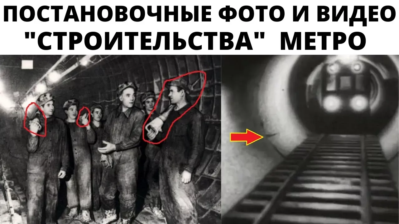 Смотрите интересные видео: Памятников старше 250 лет нет. ! https://youtu.be/zE-tO5Ms28U Загадочная усадьба; уксус и уголь, какая связь? https://youtu.be/flcIJfvvNJQ Провал грунта в Дедилово открыл тайны прошлого https://youtu.be/fDxm3xZTMIM Волгодонский канал не строили, а откапывали! https://youtu.be/ZPHGDIRCzJA В сточной канаве нашли артефакт промышленности Руси https://youtu.be/DTHj5yBxeEg Как изменить своё отношение к язычникам за 14 минут. https://youtu.be/EBA3EkjMSzM ___ Мы уже вам показывали два фильма о том что по нашей версии метро в Москве и Чикаго не строили, а откапывали. Просматривая и архивные фотографии и видеозаписи мы обнаружили еще несколько интересных моментов, с которыми хотим поделиться в этом ролике. (реклама) А мы продолжаем. В предыдущих роликах мы обратили ваше внимание на чугунные тюбинги, в тоннелях их установлено огромнее количество, они тяжелые и на грузовики тех лет много тюбингов не нагрузишь, соответчтвенно по всей Москве должны были ездить грузовики с тюбингами. Должны быть фотографии вагонов с тюбингами, грузовиков с тюбингами, должны быть фото разгрузки тюбингов, эти тюбинги должны лежать и рядом со станциями. Фотографий еще не установленных тюбингов просто нет. Вместо них есть несколько образцов советского фотошопа – вот например явный коллаж – полностью готовый тоннель, в нем уже проложены провода и кабели, то есть после строительства тоннеля прошло уже прилично времени, а в нем стоят 3 человека с отбойными молотками. Что они делали отбойными молотками в готовом чугунном тоннеле – не совсем понятно. Кстати круглые тоннели, облицованные жесткими элементами должны быть спроектированы заранее, под будущий тоннель должны быть спроектированы и изготовлены тюбинги, и сам тоннель нужно прокопать очень точно, с точностью до 1 см, иначе жесткие элементы просто не встанут на свое место. Вот в чем заключается сложность: Начертим в программе поворот тоннеля, тюбигни одинаковые на ровных участках тоннеля, а там, где поворот; на внешнем радиусе или должно быть тюбингов больше или они должны быть большего размера, а на внутреннем радиусе или тюбингов должно быть меньше или сами тюбинги должны быть меньшего размера. Если поворот тоннеля пройдет не там, или радиус поворота будет другой, тюбинг туда просто не встанет. Вот еще постановочная фотография, в которой в тоннеле у строителей знамя и много света, хотя откуда свет в подземелье? Вот видеозапись на который мы видим мультипликацию – бумажный тоннель, игрушечные рельсы и вагон с фарами движется назад. Зачем понадобилась такая мультипликация – непонятно. Мы попробовали сделать похожую мультипликацию и вот что у нас получилось. Добавим эффект старой пленки: Вот еще странное видео на котором рабочий монтирует механизмы скорее всего эскалатора разводным ключем. У кого есть машина, тот знает, что даже в подержанные Жигули нельзя лезть разводным ключом. Несколько раз покрутишь гайки разводным ключом, потом не сможешь открутить гайку. Давайте подумаем, почему у рабочих нет нормальных ключей, вот у другого рабочего тоже разводной ключ. Скептики скажут это английский эскалатор, вот они его и устанавливают, в Англии другие системы измерения, и гайки другого размера. На просторах интернета есть информация что действительно Россия купила один эскалатор, который позже скопировали. И уже скопированные эскалаторы стали устанавливать в Метр