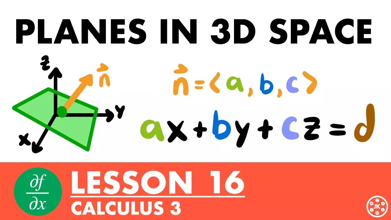 How to Find Equations of Planes in 3D Space (Calculus 3 Lesson 16) ➡️ Download my FREE Vector Cheat Sheets: https://www.jkmathematics.com//vector-cheat-sheets-calc3 🖥️ Join My Membership Site: https://www.jkmathematics.com/plus In this video you will learn how to represent planes in 3D space with an equation using a point on the plane and a normal vector (perpendicular vector). I show you where the standard and general forms of the equation of a plane come from, and then how to use them with various example problems. Additionally, you will learn how to quickly sketch graphs of planes in a 3D coordinate system by identifying x, y, and z intercepts. This video series is designed to help students understand the concepts of Calculus 3 at a grounded level. No long, boring, and unnecessary explanations, just what you need to know at a reasonable and digestible pace, with the goal of each video being shorter than the average school lecture! Calculus 3 requires a solid understanding of concepts from calculus 2, calculus 1, precalculus, and algebra. This includes limits, differentiation, advanced integration techniques, applications of derivatives and integrals, polar coordinates, parametric equations, trigonometric functions, logarithms, factoring, equation manipulation, graphing, and much more. If you are not familiar with these prerequisite topics, be sure to learn them first! Video Chapters: 0:00 Planes in 3D: What do you Need? 4:12 Finding the Standard & General Plane Equations 14:08 Summary of Plane Equations 15:06 Example: Find Plane Using Point & Normal Vector 20:58 Example: Find Plane Using Point & Parallel Plane 28:52 Example: Find Plane Using 3 Points 38:02 Sketching Planes in 3D Space 43:51 Sketching Planes Missing x, y, or z Term 48:30 Sketching Basic Planes (x=4, y=6, z=3, etc.) 📝 Examples Video: https://www.youtube.com/watch?v=AvpYh_T3Eoc ⏩ Next Lesson: https://www.youtube.com/watch?v=Thc_dfatLt8 📺 Calculus 3 Playlist: https://www.youtube.com/playlist?list=PLHdRLeAbIZE5yZ7ydR9qeB_B6CcVFlX63 📺 Calculus 2 Playlist: https://www.youtube.com/playlist?list=PLHdRLeAbIZE7KQ922piyRIDAj30XYcOIu 📺 Calculus 1 Playlist: https://www.youtube.com/playlist?list=PLHdRLeAbIZE6krGDQthaQRpLZFLD4ob54 🌐 Visit My Website: https://www.jkmathematics.com ⚡️Math Products I Recommend⚡️ Graphing Calculator: https://www.amazon.com/Texas-Instruments-TI-Nspire-Graphing-Calculator/dp/B07RL7HM5V?language=en_US Non-Graphing Calculator: https://www.amazon.com/Texas-Instruments-TI-30X-Scientific-Calculator/dp/B00SWWKEAY?language=en_US Financial Calculator: https://www.amazon.com/s?k=ba+2+plus&language=en_US Graphing Paper: https://www.amazon.com/KAISA-Punched-Loose-Leaf-Binders-150sheet/dp/B096V2RYR2?sp_csd=d2lkZ2V0TmFtZT1zcF9hdGY&language=en_US College Rule Paper: https://www.amazon.com/Mead-Filler-College-Punched-15326/dp/B000068UWB?language=en_US My Favorite Pencil: https://www.amazon.com/Quick-Mechanical-Pencil-Assorted-Barrel/dp/B07FC5NGBX?language=en_US My Favorite Erasers: https://www.amazon.com/Prismacolor-Premier-Magic-Erasers-3-Count/dp/B005ENNEJW?language=en_US Calculus Workbook: https://www.amazon.com/Essential-Calculus-Practice-Workbook-Solutions/dp/1941691242?sp_csd=d2lkZ2V0TmFtZT1zcF9hdGY&language=en_US ⚡️Textbooks I Use⚡️ Calculus 1 & 2: https://www.amazon.com/Calculus-Ron-Larson/dp/0547167024?language=en_US Calculus 3: https://www.amazon.com/Multivariable-Calculus-Ron-Larson/dp/1285060296?language=en_US Financial Mathematics: https://www.amazon.com/Mathematics-Investment-Credit-ACTEX-Academic/dp/1566987679?language=en_US ⚡️My Recording Equipment⚡️ iPad Air: https://www.amazon.com/Apple-iPad-Air-5th-Generation/dp/B09V3HJBN3?sp_csd=d2lkZ2V0TmFtZT1zcF9hdGY&th=1&language=en_US Apple Pencil (Gen 2): https://www.amazon.com/Apple-MU8F2AM-A-Pencil-Generation/dp/B07K1WWBJK?sp_csd=d2lkZ2V0TmFtZT1zcF9hdGY&language=en_US Tablet Desk Stand: https://www.amazon.com/OMOTON-Adjustable-Multi-Angle-Aluminum-Convenient/dp/B015FH0XKE?sp_csd=d2lkZ2V0TmFtZT1zcF9hdGY&th=1&language=en_US External Hardrive: https://www.amazon.com/Toshiba-HDTB420XK3AA-Canvio-Portable-External/dp/B079D3D8NR?language=en_US (Commissions earned on qualifying purchases) Find me on social media: ➡️ Facebook: https://www.facebook.com/unsupportedbrowser ➡️ Twitter: https://twitter.com/jk_mathematics ➡️ Instagram: @jk_mathematics Found this video to be helpful? Consider giving this video a like and subscribing to the channel! Thanks for watching! Any questions? Feedback? Leave a comment! - Josh from JK Mathematics #calculus Disclaimer: Please note that some of the links associated with the videos on my channel may generate affiliate commissions on my behalf. As an amazon associate, I earn from qualifying purchases that you may make through such affiliate links.
