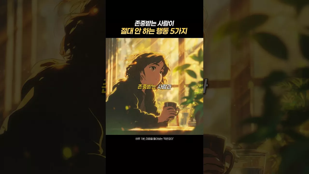 인생조언, 자기계발, 마음공부, 마음회복, 삶의지혜, 자기성찰 존중받는 사람과 무시당하는 사람의 차이, 결국 ‘태도’에 달려 있습니다. 여러분은 존중받는 태도를 가지고 있나요? 댓글로 당신의 생각을 들려주세요. 하루 1분, 마음을 돌아보는 ‘작은깊이’와 함께하세요. 구독과 좋아요는 더 많은 사람들에게 희망을 전하는 힘이 됩니다.