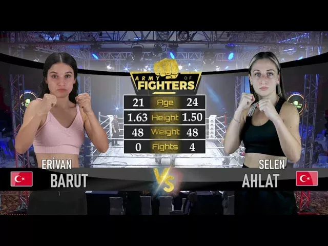 ERİVAN BARUT Turkey Weight:48Kg Age:21 Height:1,63 m. Prodebut Trainer:Gürsel Tayam / Dersim Kickboks SK 48Kg 3 Round x 3 Min. SELEN AHLAT Turkey Weight:48Kg Age:24 Height:1,50m. Records:Total 4 Match 3W-1L-0KO Trainer:Selahattin Aydın/ Sultanbeyli Belediye SK ARMY OF FIGHTERS 2 GENÇ YETENEKLER - 22/09/2021 Grand Cevahir Hotel Hall - Şişli - Istanbul-Turkey CHANNEL : TV8,5 COORDINATOR FOR TV8,5 : BARIŞ ARAGÜLÜ PROMOTER : ERKAN KESKİN COORDINATOR : SELAHATTİN AYDIN DIRECTOR : TEOMAN KOZAN COMMENTATOR : İZGE CAN GÜNAL RING ANNOUNCER : MUSTAFA ÖZBEN BU GÖRÜNTÜLERİN YAYINLANMASINA İZİN VEREN ''ARMY OF FIGHTERS'' ORGANİSYON SAHİBİ ERKAN KESKİN'E TEŞEKKÜR EDERİZ...