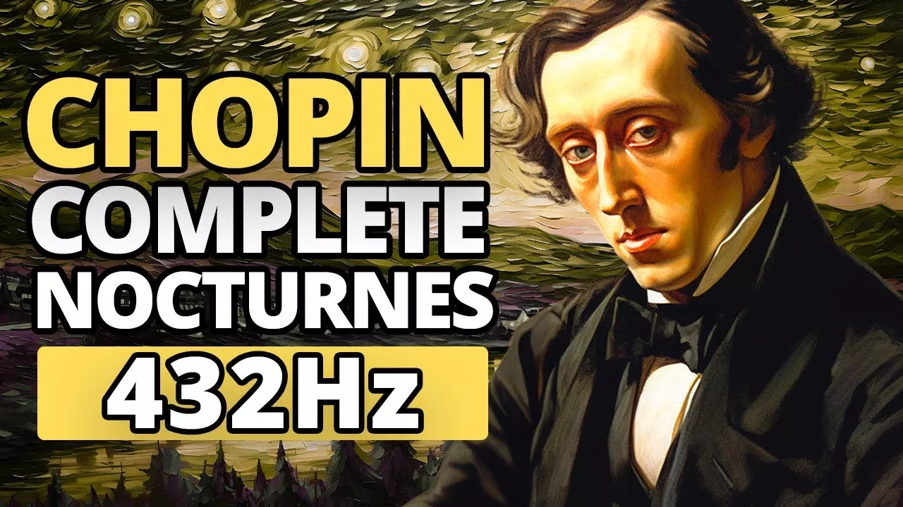 👉 Support Us On Patreon: https://bit.ly/4aUnkb5 🎧 Spotify (440Hz): https://spoti.fi/3PxW6NE 🎧 Vol. 1 Apple Music (440Hz): https://apple.co/44soWoG 🎧 Vol. 2 Apple Music (440Hz): https://apple.co/46awaP3 🎶 Buy Music in 432Hz: https://bit.ly/3RnM97W 🛒 Classical Oasis Merch: https://bit.ly/3sQOPkk 🎵 Spotify Playlists: https://spoti.fi/3uVyrk3 • Classical Piano: https://spoti.fi/44QCH0o • Updated Weekly: https://spoti.fi/3InivtQ ▶️ Complete Nocturnes (440Hz): https://youtu.be/blga9Bmz97A?si=LxWdYWcHEaFaDVrt ☕️ Donate: https://bit.ly/3nJAwMe *️⃣ Linktree: https://linktr.ee/classicaloasis ✅ Subscribe: https://www.youtube.com/channel/UCzo-s-TNyLPq41bW7VUDQ0w?sub_confirmation=1 The complete Chopin Nocturnes in 432 Hz performed by Artem Tenkeli. All 21 nocturnes from Vol. 1 & 2 have been mastered together for the best listening experience. The Nocturnes are considered to be some of Chopin's finest work and were recorded exclusively for this channel. All scenes were animated by Classical Oasis in After Effects. In Chopin's day there was no tuning standardization in place yet and different piano builders would tune their pianos on different pitches. However, Chopin's last piano was a Pleyel tuned to 435Hz, putting 432Hz pretty close to what the Nocturnes may have sounded like in his day. If you prefer these songs in the traditional 440Hz, listen to the here: https://youtu.be/blga9Bmz97A?si=9INRFdKiU5sodUJM If you enjoyed this video please help support the channel by subscribing or donating. Donations go towards funding the channel and new recording sessions with pianists. *Tip The Pianist:* Artem Tenkeli: https://buymeacoffee.com/artem_tenkeli --- 00:00 Nocturne in B-flat minor, Op. 9, No. 1 06:16 Nocturne in E-flat major, Op. 9, No. 2 11:11 Nocturne in B major, Op. 9 No. 3 17:45 Nocturne in F major, Op. 15, No. 1 22:39 Nocturne in F-sharp major, Op. 15, No. 2 26:28 Nocturne in G minor, Op. 15, No. 3 31:11 Nocturne in C-sharp minor, Op. 27, No. 1 35:52 Nocturne in D-flat major, Op. 27, No. 2 42:06 Nocturne in B major, Op. 32, No. 1 47:46 Nocturne in A-flat major, Op. 32, No. 2 53:02 Nocturne in G minor, Op. 37, No. 1 59:48 Nocturne in G major, Op. 37, No. 2 1:06:26 Nocturne in C minor, Op. 48, No. 1 1:13:10 Nocturne in F-sharp minor, Op. 48, No. 2 1:20:56 Nocturne in F minor, Op. 55, No. 1 1:26:26 Nocturne in E-flat major, Op. 55, No. 2 1:31:42 Nocturne in B major, Op. 62, No. 1 1:38:59 Nocturne in E major, Op. 62, No. 2 1:45:11 Nocturne in E minor, Op. 72, No. 1 1:50:00 Nocturne in C-sharp minor, Op. Posth., WN 37 1:54:19 Nocturne in C minor, Op. Posth., WN 62 --- All recordings and video © 2023 Classical Oasis AI Art created with Midjourney Version 5 https://www.midjourney.com/ If you are a classically trained pianist or musician and are interested in performing in an upcoming video, please send me an e-mail to the email in the about section. --- #chopin #nocturne #classicalmusic #romanticpiano #432hz