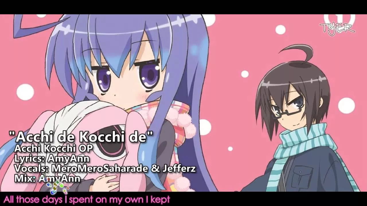 Anime: Acchi Kocchi / Place to Place (あっちこっち) Song: "Acchi de Kocchi de (あっちでこっちで)" Original: Acchi⇔Kocchi Picked by AmyAnn Lyrics: AmyAnn https://www.youtube.com/user/DDPFandubs Vocals: MeroMeroSaharade & Jefferz https://www.youtube.com/user/MeroMeroSaharade https://www.youtube.com/user/Jefferzkm Mixing: AmyAnn Subs: AmyAnn TYER Links: ♦Tumblr: http://tyerecords.tumblr.com/ re:TYE Links: ♦YT Channel: https://www.youtube.com/@retye ♦Bluesky: https://bsky.app/profile/re-tye.bsky.social ♦Patreon: https://www.patreon.com/retye?ty=h ♦X: https://x.com/re_tye Lyrics: One, two, three, four! One, two, three, four! Oh! Oh! Let’s go! When others tell me it’s love, I just get confused All I want is to keep on watching you Being inexperienced it’s hard to just speak out I’m trying to guess if you’ve noticed even a bit It’s the biggest mystery we’ve made Da, da, da, da, da, da, da! All those days I spent On my own, I kept On feeling there was something missing from my heart But when we get together The days are so much better So come on out and play, it’s time to start! Over here, we’re holding hands Over there, mischevious plans This heartwaming harmony Makes sure that we’re all kept at ease Over here, start to relax Over there, taking our nap My heart feels all warm and fuzzy inside Because you’re right here by my side #acchikocchi