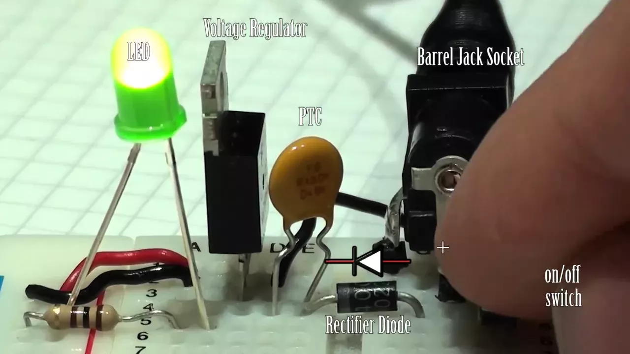 This video continues from a previous video on setting up a simple battery power supply on a breadboard. This video uses a mains transformer 9V Power Supply Unit (PSU) that allows us to power circuits without the need of a battery. However, the supply is noisy and could lead to difficulties. A diode is added to protect the circuit from reverse connections. A switch is added to simplify usage. A PTC (Positive Temperature Coefficient) Transducer is added to protect the circuit from short connections and Capacitors are added to smooth the supply. We use the oscilloscope to examine the quality of the output supply.