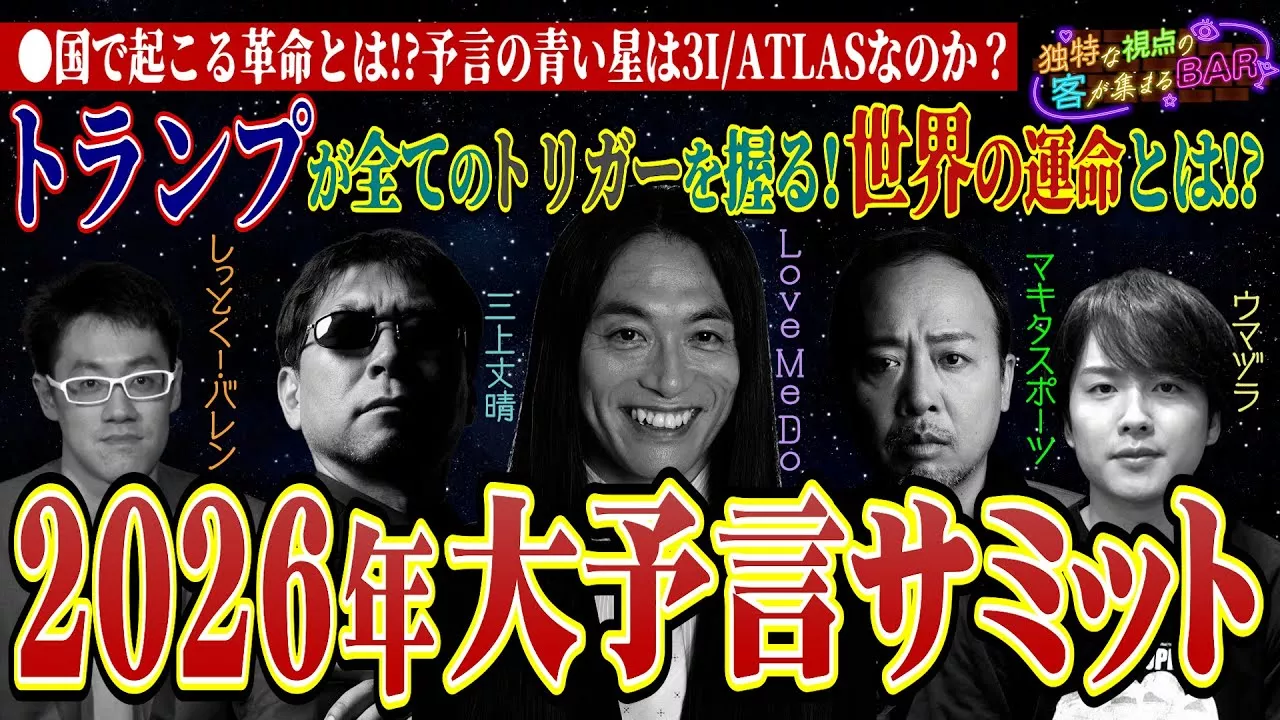 <目次> 0:00 BAR開店 7:31 丙午の年はココに注目! 12:18 2026年芸能界 注目の漢字 16:57 エコノミスト2026 24:41 2026年ラッキーカラー 25:56 サッカーW杯優勝国は!? 32:43 カンノ情報局 オススメ書籍紹介 39:32 予言の青い星は3I/ATLAS? 53:30 誰でもできる2026年開運行動 某所にある独特な視点の客が集まるBAR。 好評につきシーズン3として月一配信が決定! 1回目となる今回は、Love Me Doさんがご来店。2026年起こるかもしれない事態を徹底予言! 10分でわかる公認切り抜き配信中! チャンネルはコチラ→www.youtube.com/@FINESKYTV 出演: マキタスポーツ 三上丈晴(月刊ムー編集長) Love Me Do 菅野大輔(東京ニュース通信社/スカパー!TVガイドプレミアムの中の人) 二島美羽 #スカパー #予言 #都市伝説 #2026年