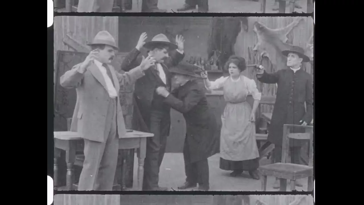 Playing this upload at 0.75x speed is ideal; The film has not been speed-corrected. Written by Stanner E.V. Taylor, Griffith's tale of triumph for the underdog stars Arthur V. Johnson as John Bradley, an oil company clerk whose manager asks him to make a large bank deposit. A notorious gambler (Dell Henderson) overhears the conversation and, intercepting John on the way to the bank, invites him to play cards. Declining the card game but accepting a drink, John is drugged by the gambler and passes out. When John comes to, he confronts the dishonest men and is told he lost the money at cards. The townspeople, including the U.S. Marshall (George Nichols), side with the gamblers and refuse to help John. He tells his wife (Florence Barker) the bad news. She begs the gamblers for the money back, only to be thrown out of the saloon. She wanders the streets looking for help and finds two pistol-packing priests (W. Chrystie Miller, Frank Opperman?), true adherents to the Scriptural charge to aid the oppressed. They recover the money at gunpoint and return it to John and his manager. The film appears complete, lacking perhaps only the A&B logo that would've been present at ending. This archival film material comes from the collections of the Library of Congress. 2K MOV file purchased from the LoC's National Audio Visual Conservation Center.
