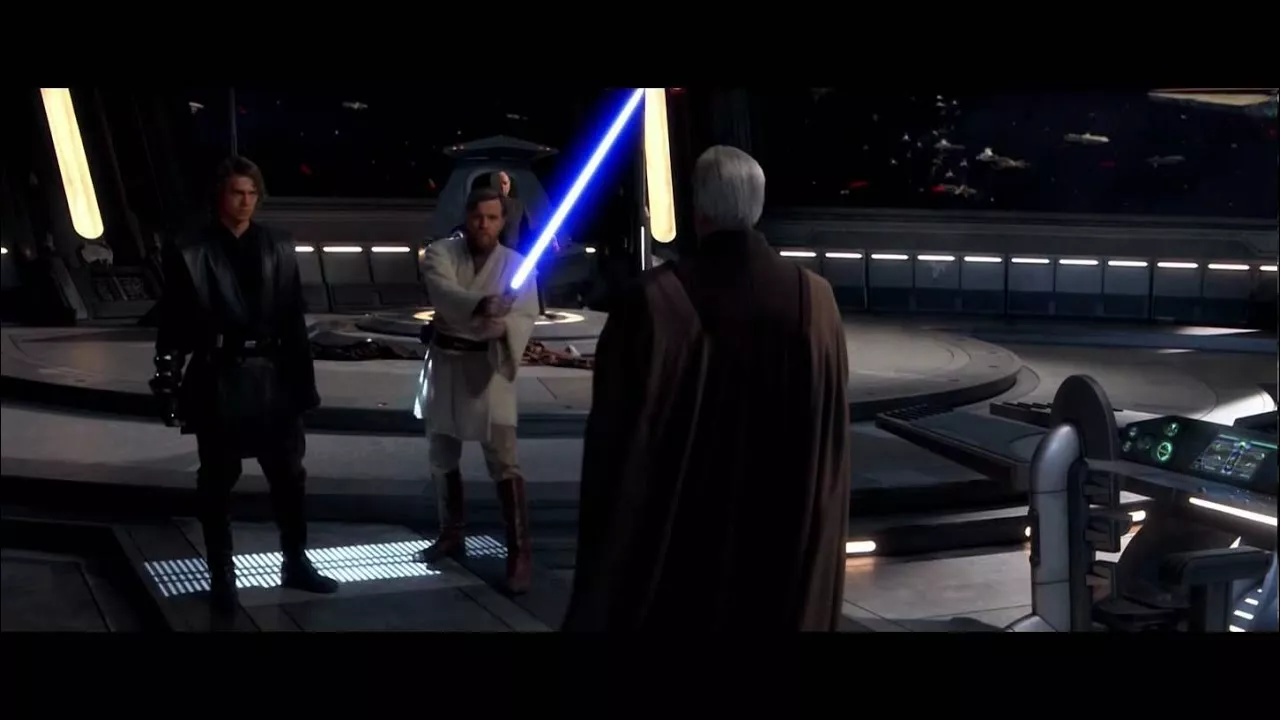 The lightsaber duel between Anakin Skywalker, Obi-Wan Kenobi, and Count Dooku.