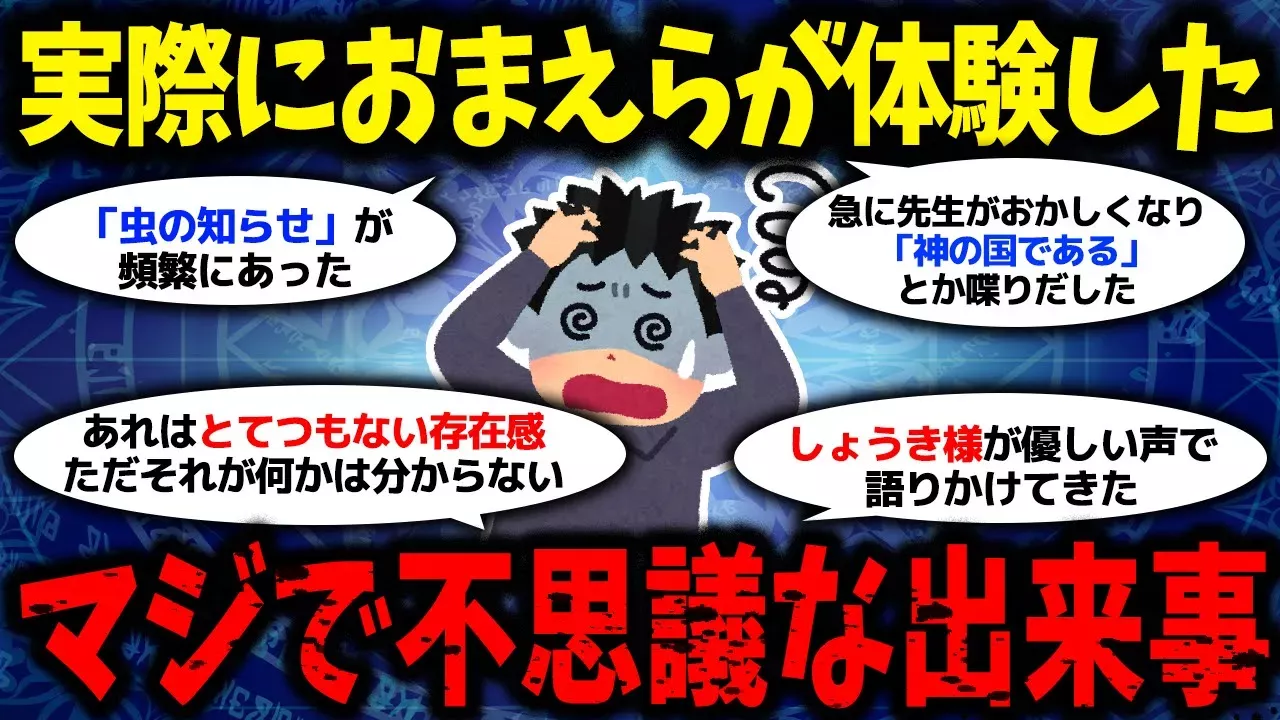 コメント欄で不思議な体験をぜひ教えてね! ▼part2はこちらから https://www.youtube.com/watch?v=7EiByOQ2SYA ▼チャンネル登録はこちらから https://www.youtube.com/channel/UC4XY_5Rk4XF5TBH8D1xEoGw?sub_confirmation=1 ※当チャンネルは、5ちゃんねる様よりコンテンツ使用許諾を承認済みです。