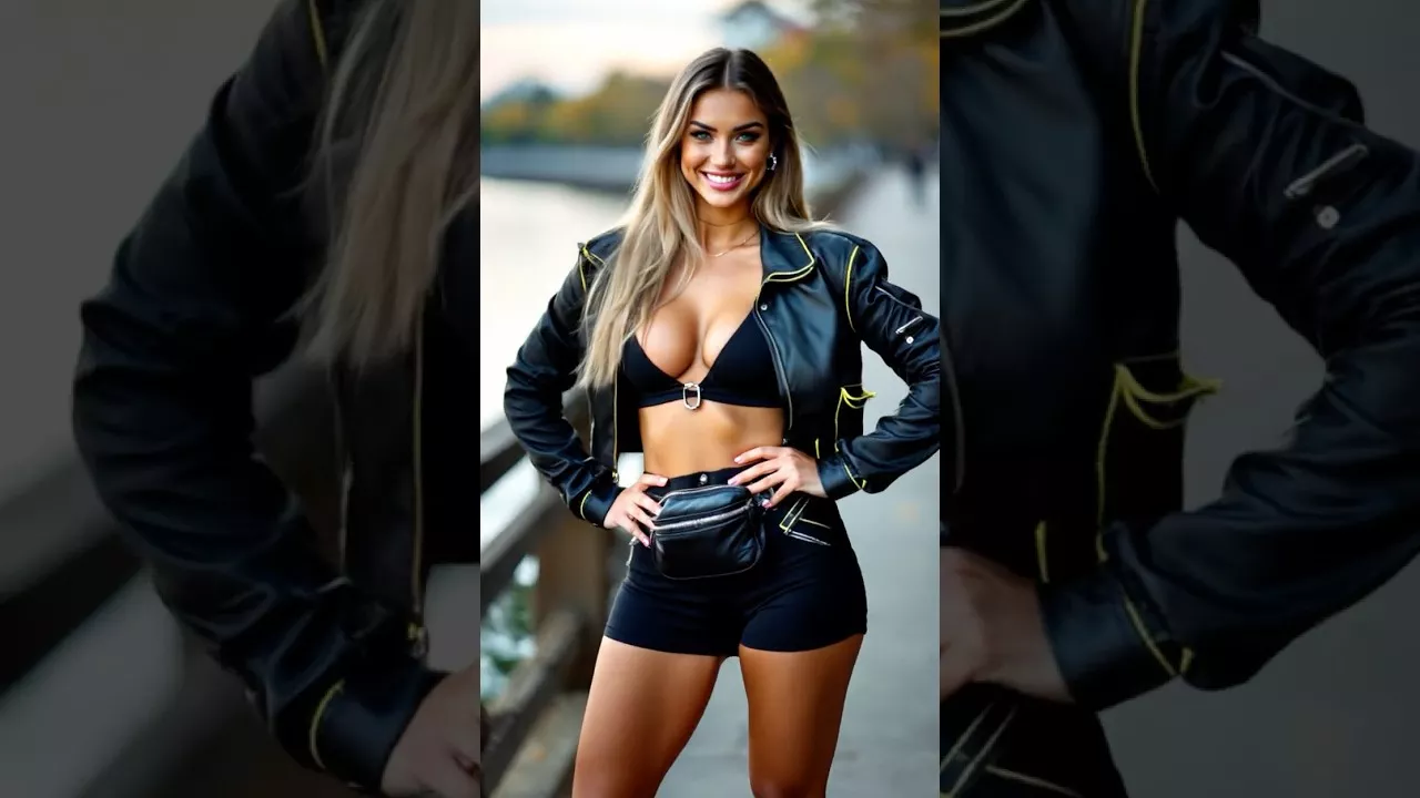 Street fashion meets sporty edge! 🖤👢 Watch this beautiful model redefine urban chic in a sleek black biker short set, cropped leather jacket, and bold black ankle boots with chunky heels—where athleisure meets high-fashion glam. 🌟 Outfit Breakdown: 🚴♀️ Black Biker Short Set: Neon yellow piping adds a pop of energy to this sporty silhouette. 🧥 Cropped Leather Jacket: Edgy, fitted, and perfect for contrast against the urban backdrop. 👢 Black Ankle Boots: Chunky heels for stability + sleek design to elevate the streetwear vibe. 💫 Accessories: Sleek black fanny pack + silver stud earrings keep the look sharp and functional. 🌉 Scene Stealer: Ash blonde straight hair, green eyes, and a riverside walkway at dusk create moody, modern energy. Early evening light highlights her diamond-shaped face, pink lips, and fierce pose against wooden railings—pure confidence! 💥 Why This Look Trends: ✅ Athleisure Upgrade: Biker shorts + leather jacket = gym-to-street versatility. ✅ Contrast Play: Matte black + neon accents = eye-catching street style. ✅ AI-Powered Forecast: Sporty glam dominates 2024’s urban fashion scene. 💖 LIKE, SUBSCRIBE, and hit the 🔔 for AI-powered fashion innovation! 👉 Channel: @AISpecialist-v7z 🌟 Share the sporty vibes: https://www.youtube.com/@AISpecialist-v7z #CroppedLeatherJacket #ChunkyHeels #AiFashion #AiModel #NeonAccents #FannyPackStyle #AshBlondeHair #UrbanEdge #SportyGlam #RiversideStyle #DiamondFace #PinkLips #FashionTech #FashionTrends #OOTD #TikTokFashion #BikerShortsFashion #LeatherJacketFashion #AnkleBootsFashion #ShortVideo #Fashionista #StreetChic #ModelStyle #FashionGoals #TrendyBikerShorts #TrendyLeatherJackets #UrbanFashion #Beautiful #Beauty #Sexy #AiSexy ✨ Biker shorts, boots, & AI flair—press play to own the streets in style! ⚡