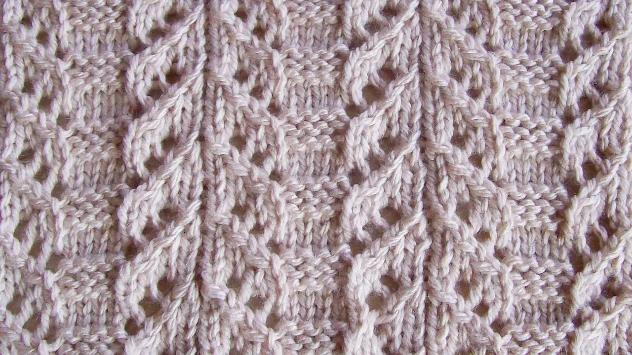 Японский ажурный узор с текстовым описанием. Вертикальные неширокие ажурные дорожки создают красивое полотно. Можно также использовать их как фрагмент. Раппорт составляет 13 петель в ширину и всего 6 рядов в высоту. Cast on multiple of 13 sts + 1 Repeat 1 – 6 rows Row 1(RS): * p1, k2, k2tog, yo, k4, yo, skp, k2 *, p1 Row 2(WS): purl – purl, knit – knit Row 3(RS): * p1, k1, k2tog, yo, k6, yo, skp, k1 *, p1 Row 4(WS): * k1, p4, k4, p4 *, k1 Row 5(RS): * p1, k2tog, yo, k2, p4, k2, yo, skp *, p1 Row 6(WS): * k1, p4, k4, p4, *, k1