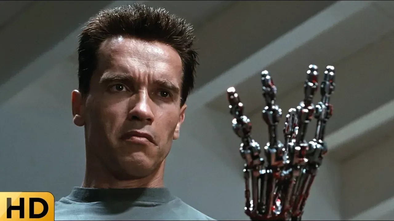 Поставь лайк, подпишись, оставь комментарий и поделись в соцсетях. Терминатор показывает металлическую руку. Отрывок из фильма "Терминатор 2: Судный день" (Terminator 2: Judgment Day, 1991). Правообладатель Studiocanal, Lionsgate, Paramount Pictures разрешил нам использовать это видео. Прошло более десяти лет с тех пор, как киборг-терминатор из 2029 года пытался уничтожить Сару Коннор — женщину, чей будущий сын выиграет войну человечества против машин. Теперь у Сары родился сын Джон и время, когда он поведёт за собой выживших людей на борьбу с машинами, неумолимо приближается. Именно в этот момент из постапокалиптического будущего прибывает новый терминатор — практически неуязвимый и способный принимать любое обличье. Цель нового терминатора уже не Сара, а уничтожение молодого Джона Коннора. Однако шансы Джона на спасение существенно повышаются, когда на помощь приходит перепрограммированный сопротивлением терминатор предыдущего поколения. Оба киборга вступают в смертельный бой, от исхода которого зависит судьба человечества. Режиссер: Джеймс Кэмерон. Актеры и роли: Арнольд Шварценеггер - Терминатор (T-800) Линда Хэмилтон - Сара Коннор Эдвард Фёрлонг - Джон Коннор Майкл Эдвардс - взрослый Джон Коннор Роберт Патрик - T-1000 Эрл Боэн - доктор Питер Сильберман Джо Мортон - Майлз Беннет Дайсон Дженетт Голдстин - Джанелл Войт опекунша Джона Коннора Ксандер Беркли - Тодд Войт опекун Джона Коннора Эпата Меркерсон - Тарисса жена Дайсона Дэнни Кукси - Тим приятель Джона Коннора Лесли Хэмилтон Джаррен - двойник Сары сон Сары Дон Стэнтон - охранник Льюис Майкл Бин - Кайл Риз во сне Сары.