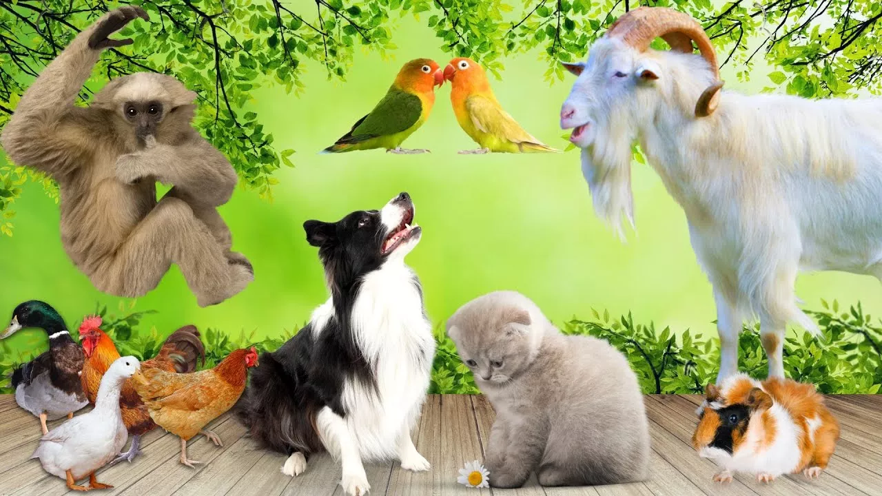 Herd of cows grazing in the sun. Two parrots playing on a tree branch. Kitten hobbles to walk. In the park, there are many dogs playing. In the forest, the mother monkey peels bananas for the baby monkeys. Goats are grazing on the hill.