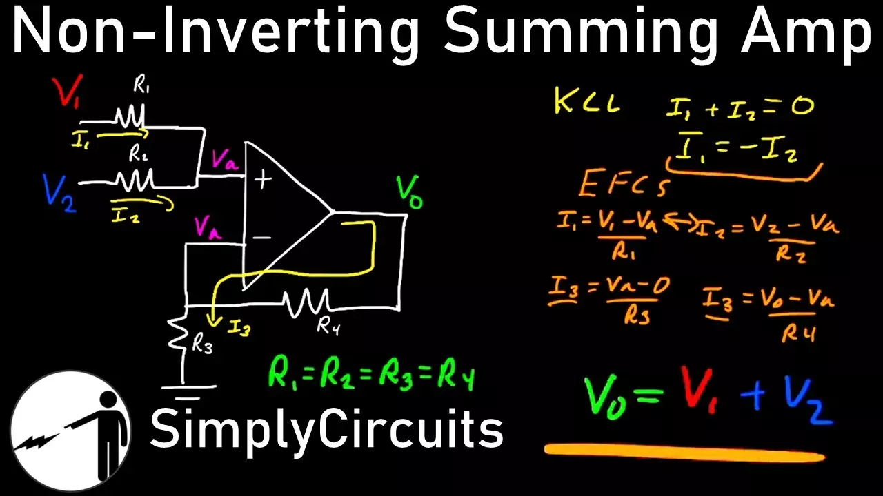 In this electrical engineering tutorial, I go over the non-inverting summing amplifier and derive the output voltage in terms of the input voltages. This operational amplifier circuit enables the addition of two voltages without inverting the output. This can be particularly useful if you are powering your op-amp with a single voltage source and your output is bounded between zero and your upper rail.