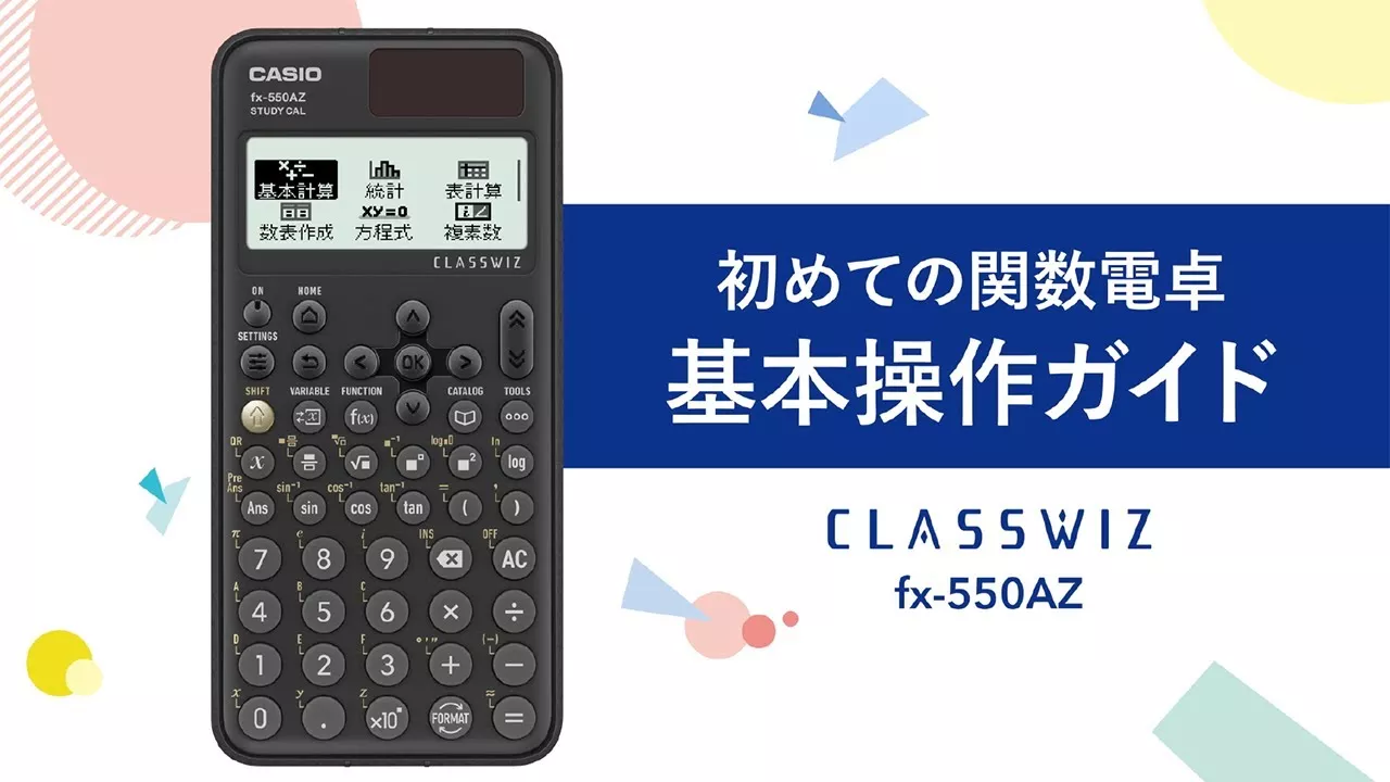 初めての関数電卓 基本操作ガイド CLASSWIZ fx-550AZの操作方法全般を説明します。 「関数電卓の基礎知識」 00:00 オープニング・目次 00:53 1.液晶表示とキーの配列 02:23 2.電源ON/OFFの方法 02:50 3.電卓の設定 04:10 4-1.表示形式の設定~入力/出力 05:31 4-2.表示形式の設定~角度単位 07:02 4-3.表示形式の設定~表示桁数 08:15 5.システム設定の変更~言語 08:52 6.リセット項目の実行~初期化 09:52 7.“はじめに”の選択 「関数電卓の基本計算」 10:30 目次 10:46 1.電卓アプリを選ぶ 11:20 2.計算式の入力と結果表示の切替 12:46 3.入力の訂正方法 13:33 4.引き算キーと負符号キーの使い分け 15:30 5.数の計算 ①加減乗除の計算 16:53 5.数の計算 ②分数の計算 18:13 5.数の計算 ③指数の計算 18:59 5.数の計算 ④無理数の計算 19:56 5.数の計算 ⑤対数の計算 21:33 5.数の計算 ⑥複素数の計算 23:14 6.関数の計算 ①三角関数の計算 25:44 6.関数の計算 ②積分の計算 26:45 7.度分秒の形式変換と計算 「その他の計算/便利な機能」 29:08 目次 その他の計算 29:20 行列の計算① 32:22 行列の計算② 便利な機能 36:53 1.各種メモリーの利用① 41:18 1.各種メモリーの利用② 45:31 2.QRコード連携 47:50 3.ClassWiz エミュレーターの利用方法