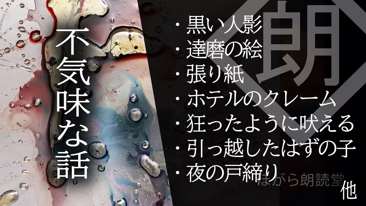 00:00:00 OP 00:00:10 B子さん 00:03:37 黒い人影 00:05:57 達磨の絵 00:08:27 肝試し 00:10:05 張り紙 00:12:04 病院での出来事 00:13:48 「夜になると1番モニターが砂嵐になってる事があります」 00:17:37 ホテルのクレーム 00:21:38 今までに見た尤も不幸な結婚式 00:23:11 知らない女がベッドに寝ていた 00:25:02 昔住んでいた部屋 00:34:38 狂ったように吠える 00:39:53 事故物件 00:42:35 カラオケボックスで働いてた時の事 00:46:07 引っ越したはずの子 00:49:23 夜の戸締り 00:53:09 中国に長期駐在していた時のこと 01:00:49 真夜中のクラクション リクエストや質問、怖い話等の投稿はこちらまで。(マシュマロ質問箱) https://marshmallow-qa.com/hogara_rodoku?utm_medium=url_text&utm_source=promotion ほがら朗読堂 ニコニコ支店 https://www.nicovideo.jp/user/125018693 twitterはこちら https://twitter.com/hogara_rodoku -------------------------- #ほがら朗読堂#朗読