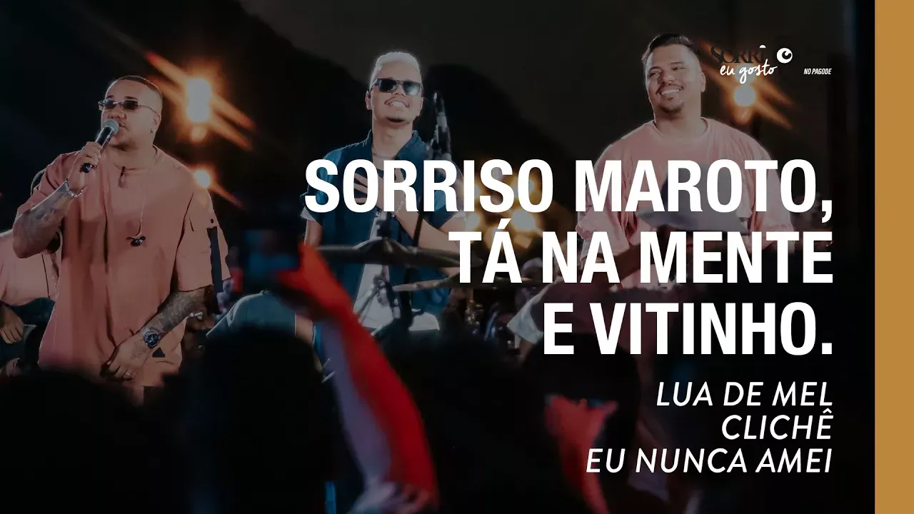 Este é o clipe oficial da música "Lua De Mel/Clichê/Eu Nunca Amei" com participações do Tá Na Mente e Vitinho, faixa do novo audiovisual Sorriso Eu Gosto No Pagode - Parte 1. Acompanhe o Sorriso Maroto nas redes sociais: Facebook: https://www.facebook.com/sorrisomaroto Instagram: http://instagram.com/sorrisomaroto Twitter: https://twitter.com/sorrisomaroto Lua de Mel (Douglas Lacerda / Valtinho Jota) Tô precisando demais desse abraço Tô precisando juntar meus pedaços Vou te contar com detalhes por que eu ando triste assim Já faz um tempo que eu não te desejo Não te procuro nem peço seus beijos Sinto que a nossa história está caminhando pro fim Eu cheguei até fazer as malas Eu chorei ao decorar as falas Mas pra que se eu sei que a gente ainda se ama Eu vou rezar pra gente se entender Eu tenho um plano pra reacender a nossa chama Minhas malas estão prontas, mas também tem roupas suas Vamos pra uma lua de mel Faça eu me apaixonar, traz de novo aquele olhar Que no passado me paralisou atravessando a rua Abre esse sorriso pra mim Seja lá pra onde for, diz que aceita por favor Vale a pena lutar pra salvar o nosso amor Clichê (Sergio Jr / Thiago Silva) Sem você passei a ver o que nunca enxerguei Sem você me dei um tempo e me repensei Eu me vi naquelas folhas de outra estação Que sem vida são varridas secas pelo chão Acredito hoje em coisas que me ensinou Acredito que dias melhores estão por vir Que amores de verdade surjam no olhar Acredito que a gente possa ser feliz Desculpe chegar sem avisar Mas eu não consigo esquecer Você dizendo que já não me ama Ensaiei mil coisas pra falar Pra mim são difíceis de dizer Em sonhos de amor sua voz me chama Sei que parece clichê preciso de você Meu amor, eu tive que perder pra acordar Eu sei que fui difícil de lidar Sempre fechado, sem falar de amor, de sol, de flor Vim contar que ando amargando a solidão Você me fez sentir o coração pulsar, doer Mesmo se não voltar, queria te dizer Que aprendi a ser melhor com você Eu Nunca Amei (Bruno Cardoso / Sergio Jr / Thiago Silva) Eu nem sei como te dizer Foi complicado amor eu sei Por quanta vezes sem querer Falhei contra o amor e desdenhei Pra não chorar, pra não sofrer Melhor não amar mais fácil enfim E era assim a minha lei Até você chegar pra mim Desculpe o que eu não fiz Desculpe o que falei Nunca deixei ninguém entrar na minha vida Desculpe agir assim Desculpe nunca amei Eu nunca amei, pois nunca Encontrei alguém como você Eu nunca amei, por que ninguém Fez minha força estremecer Eu nunca amei, por que ninguem Me fez cantar sair de mim Eu nunca amei, por ser você O meu principio, meio e fim Ieie... ieieie... ieie... ieieie... ieie #SorrisoMaroto #TáNaMente #Vitinho #LuaDeMel #Cliche #EuNuncaAmei #SorrisoEuGostoNoPagode