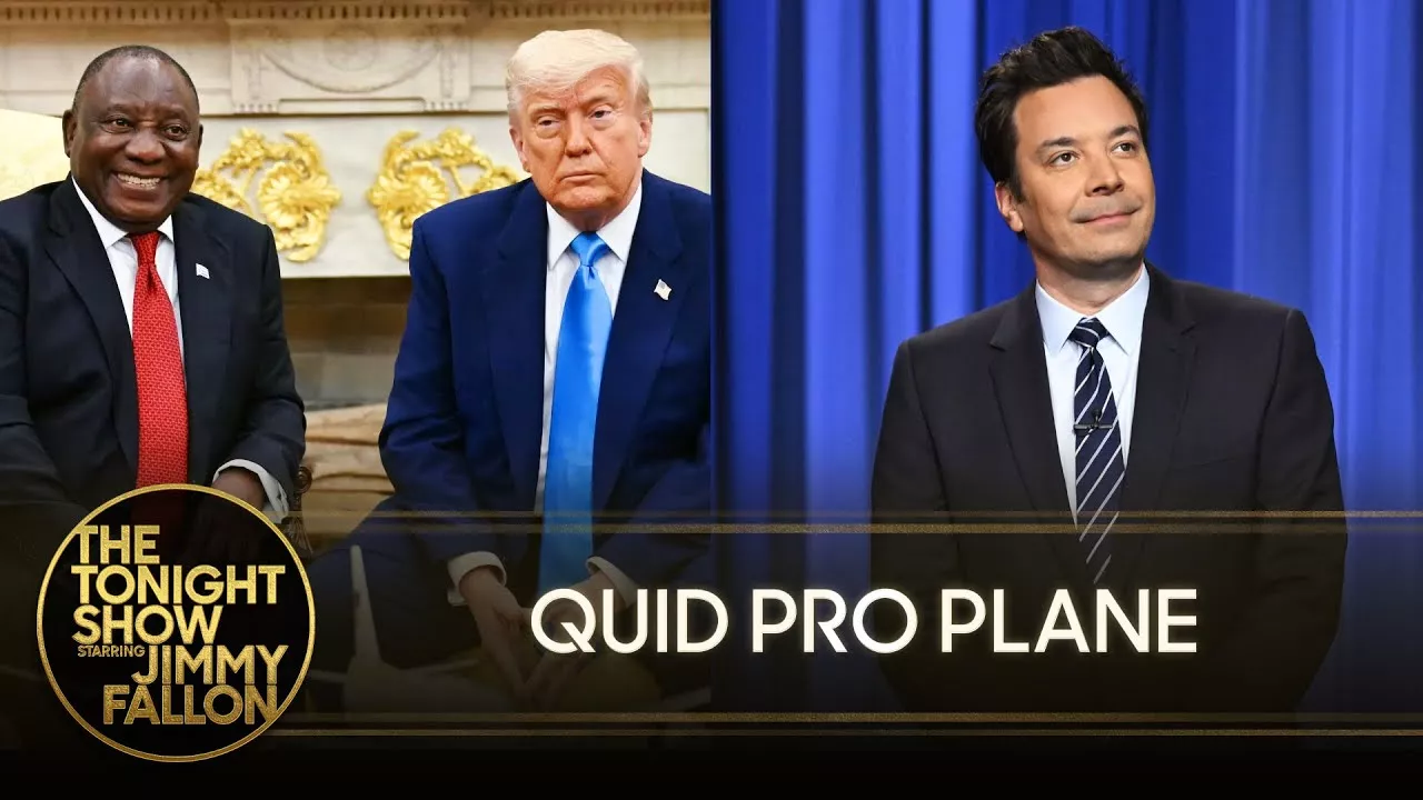 Jimmy addresses the latest news, like the Senate passing an act that allows people to not pay taxes on cash tips, Trump meeting with South Africa's president and the Pentagon officially accepting the $400 million Qatar plane. The Tonight Show Starring Jimmy Fallon. Stream now on Peacock: https://www.peacocktv.com/unavailable Subscribe NOW to The Tonight Show Starring Jimmy Fallon: https://www.youtube.com/channel/UC8-Th83bH_thdKZDJCrn88g?sub_confirmation=1 Watch The Tonight Show Starring Jimmy Fallon Weeknights 11:35ET/10:35c Get more The Tonight Show Starring Jimmy Fallon: https://www.nbc.com/the-tonight-show JIMMY FALLON ON SOCIAL Follow Jimmy: http://Twitter.com/JimmyFallon Like Jimmy: https://www.facebook.com/unsupportedbrowser Follow Jimmy: https://www.facebook.com/unsupportedbrowser Follow Jimmy on Threads: https://www.facebook.com/unsupportedbrowser Follow Jimmy on TikTok: https://www.tiktok.com/@jimmyfallon THE TONIGHT SHOW ON SOCIAL Follow The Tonight Show: http://Twitter.com/FallonTonight Like The Tonight Show: https://www.facebook.com/unsupportedbrowser Follow The Tonight Show: https://www.facebook.com/unsupportedbrowser Follow The Tonight Show on Threads: https://www.facebook.com/unsupportedbrowser The Tonight Show TikTok: https://www.tiktok.com/@fallontonight The Tonight Show Starring Jimmy Fallon features hilarious highlights from the show, including comedy sketches, music parodies, celebrity interviews, ridiculous games, and, of course, Jimmy's Thank You Notes and hashtags! You'll also find behind the scenes videos and other great web exclusives. GET MORE NBC NBC YouTube: https://www.youtube.com/nbc Like NBC: https://www.facebook.com/unsupportedbrowser Follow NBC: http://Twitter.com/NBC NBC Instagram: https://www.facebook.com/unsupportedbrowser Trump Confronts South Africa's President, Pentagon Accepts Qatar's $400 Million Plane Bribe https://www.youtube.com/fallontonight