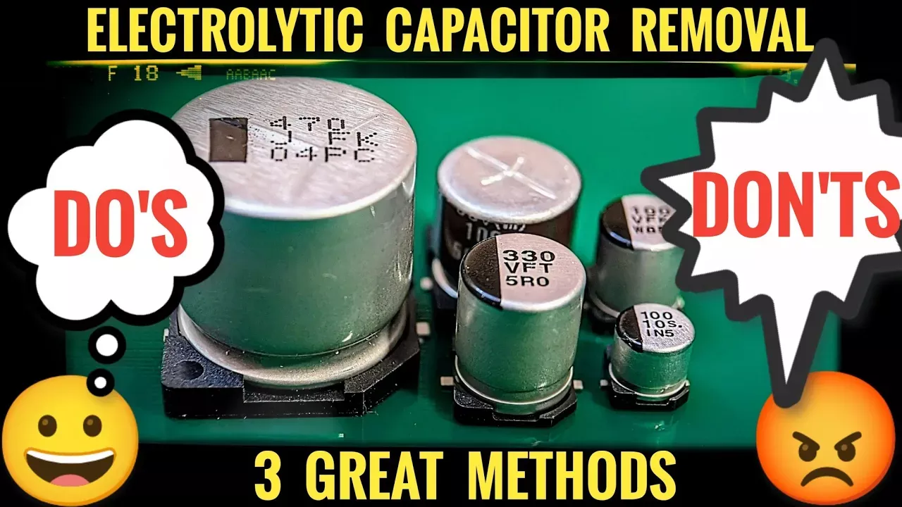 How to remove Electrolytic Capacitors - 3 great Methods , is a clear , informative soldering tutorial showing the 3 best removal options for your SMD Electrolytic Capacitors. Including clear , informative video guides of every method , you will get to learn the best option for each different Electrolytic removal scenario. Showing Do's and Don'ts and things that can go wrong , this guide is all you need to help you with your Electrolytic capacitor removals in the future. If you enjoy this soldering tutorial and find it of use please consider liking and subscribing and make sure to hit the notification bell so as to not miss out on any future soldering / desoldering releases on the Mr SolderFix YouTube channel. Thank you for your time and Good luck. Mr SolderFix Music Supplied By https://click.pstmrk.it/3s/uppbeat.io%2Ft%2Fhartzmann%2Fclear-sky/vZub/d3m4AQ/AQ/69acd055-835d-4895-a642-d46e352a7c54/4/79svh8yQKP