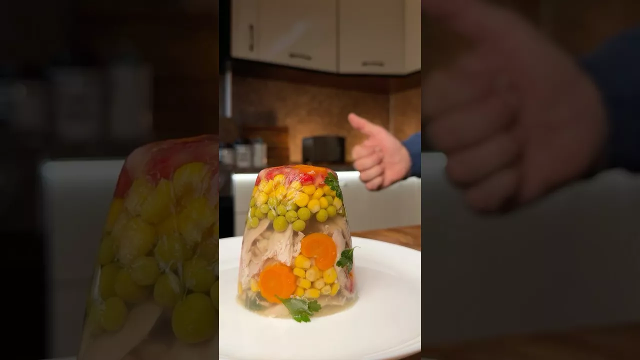 Ингредиенты: куриные бёдра 1 кг лавровый лист 2 шт чёрный перец 6 горошин соль 1 ст.л. душистый перец 4 горошины чеснок 2 зубчика лук 1 шт морковь 2 шт желатин 30 г петрушка 5 веточек консервированный горошек 200 г консервированная кукуруза 200 г гранат 1 шт Мясо заливаем водой, ставим на огонь и варим 2–3 минуты. Затем сливаем воду, добавляем новую (очищенную, чтобы бульон получился прозрачным), лавровый лист, чёрный перец, соль, душистый перец, чеснок, лук, морковь и варим до готовности. После этого разбираем мясо, морковь нарезаем мелко или вырезаем формочками. Разводим желатин в 60 г воды Начинаем формировать в порционных формах: листья петрушки, морковь, кукуруза, зелёный горошек, зёрна граната. В центре — мясо, и снова слои: горошек, кукуруза, гранат, морковь, петрушка Разбухший желатин растапливаем в микроволновке, смешиваем с оставшимся бульоном и заливаем смесь в формы. Даём полностью остыть и убираем в холодильник на ночь Через время блюдо готово — всех с наступающим Новым годом!